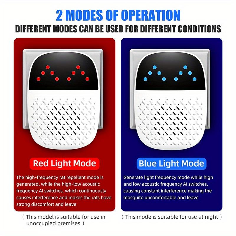 EASY OPERATION - Simply plug the ultrasonic pest repeller into an electrical outlet. The pest repeller plug will automatically emit variable frequency ultrasonic waves. Press the switch to switch the working mode. Red high-frequency mode is suitable for unattended use at home. Blue low frequency mode is suitable for sleeping at night. It is recommended that you install the repeller 30-70 inches above the ground.