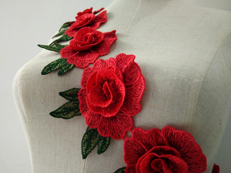1 Yard Red Flower Embroidered Lace Fabric Trim
