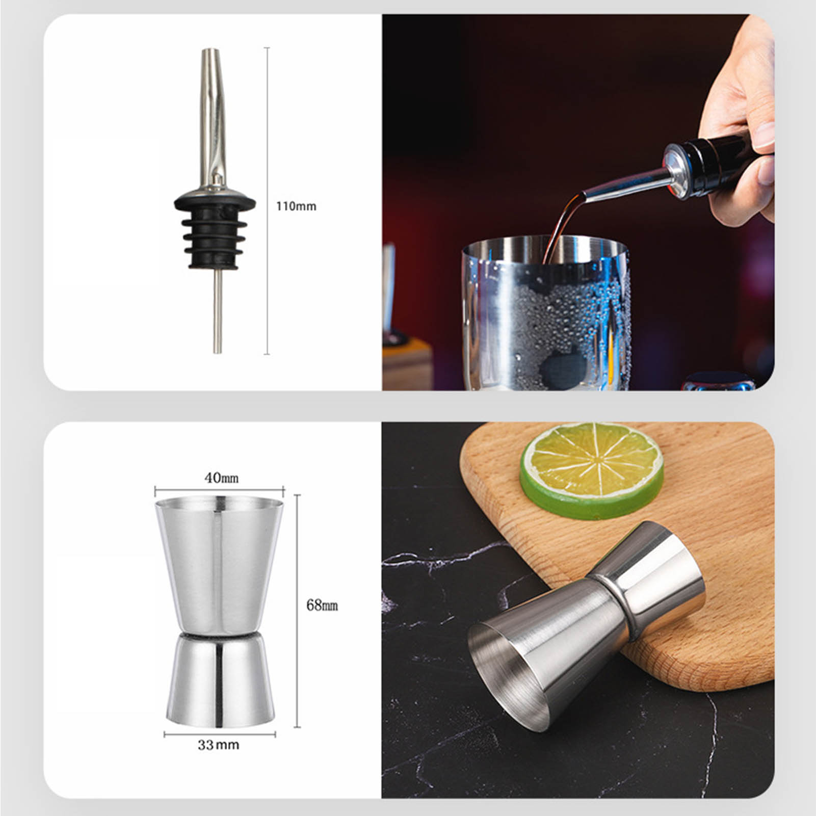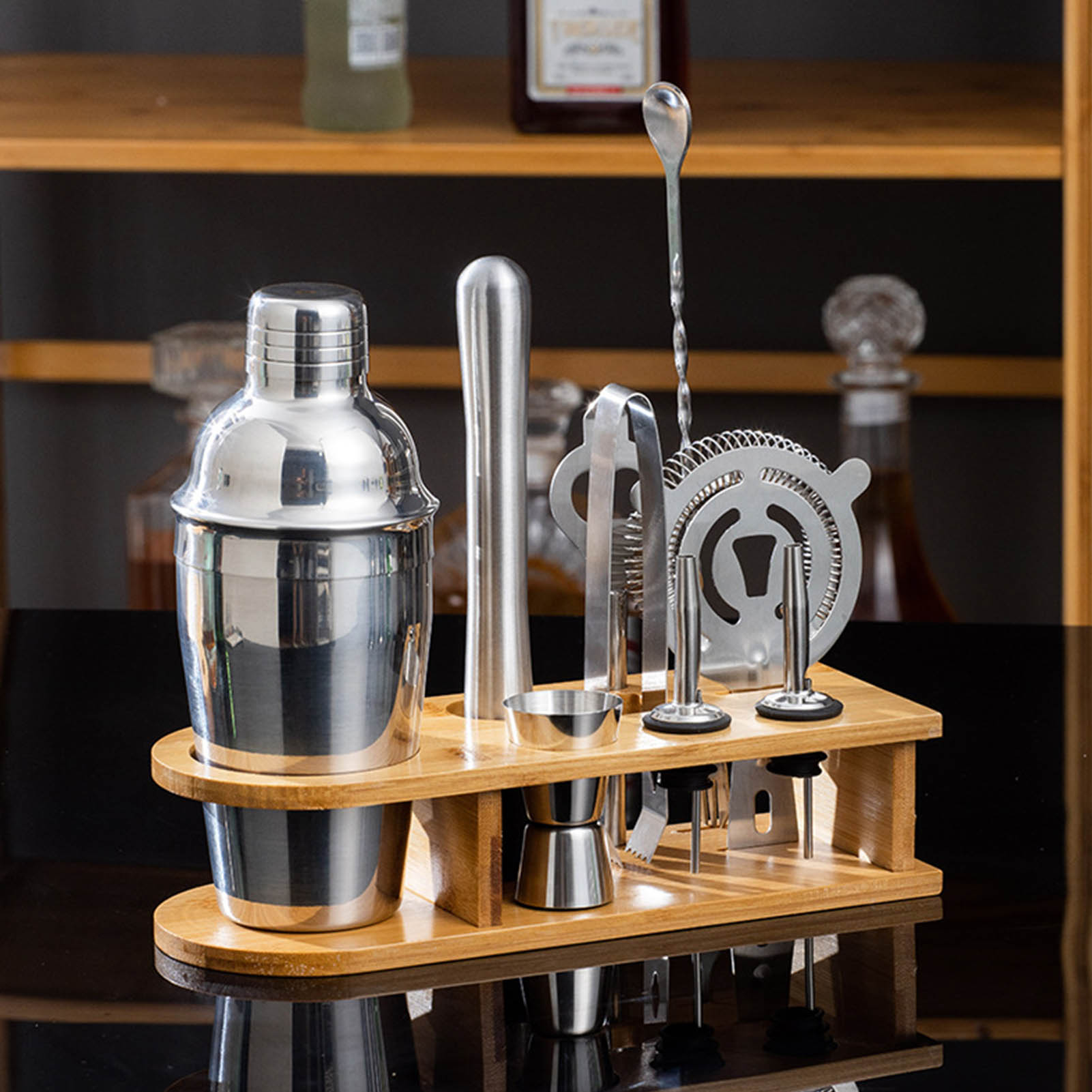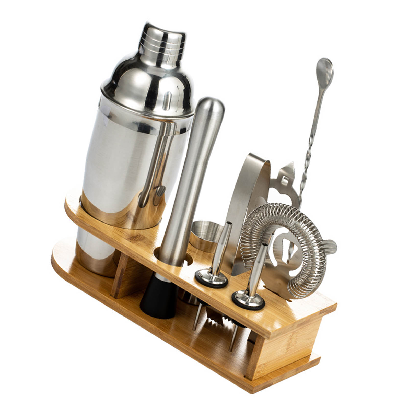 1Premium Stainless Steel: Our cocktail mixing tool set is made of premium stainless steel material that is safe and durable to use. 2Prevent Leakage: The shaker cup adopts advanced steel mould, and the connection size between cup and cover is perfectly matched to prevent leakage. 3Honeycomb Filtration: The honeycomb filtration and super long water outlet prevent broken ice from flowing smoothly into the mouth. 4With Bamboo Rack: The cocktail shaker cup set includes a bamboo rack that can better arrange your tools for easy storage. 5Delivery: This kit includes 10 pieces that are one shaker, filter, measuring cup, bottle opener, ice clip, spoon, bamboo frame, ice breaking hammer and two guide nozzle.