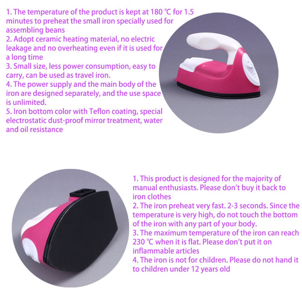 1 Portable use: Mini electric iron has extremely high portability and can be easily put into any bag and tool box. 2 The product temperature is a constant temperature of 180 degrees Celsius and can be preheated within 5 minutes. If you lay it flat, the maximum temperature can reach 230 degrees Celsius. Please do not place it on flammable materials. 3 No leakage: Made of professional ceramic heating materials, the iron has no leakage. 4 Suitable occasions: Perfect for college, travel and quick ironing to touch up makeup. 5 Adult: Single temperature only. This is not a toy and the iron is for adults only.Specification 6Product name: Mini electric iron 7Voltage: 110V-220V 8Material: PVC + Aluminum + Ceramic 9Size: 10 * 6 * 6.5cmFeature: 10 This product is designed for most craft lovers, please do not buy it back into comfortable iron clothes. 11 Use ceramic heating materials, no leakage within 2-3 seconds, high temperature, do not let any part of the body touch the bottom of the console. 12 The bottom of the iron is coated with polytetrafluoroethylene, and the surface of the special electrostatic dust-proof mirror is treated, which is waterproof and oil-proof. 13 The temperature of the product is a constant temperature of 180 degrees Celsius, which can be preheated within 5 minutes. The maximum temperature can reach 230 degrees Celsius in normal conditions. Please do not place it on flammable materials.Package included: 141 X Mini electric iron