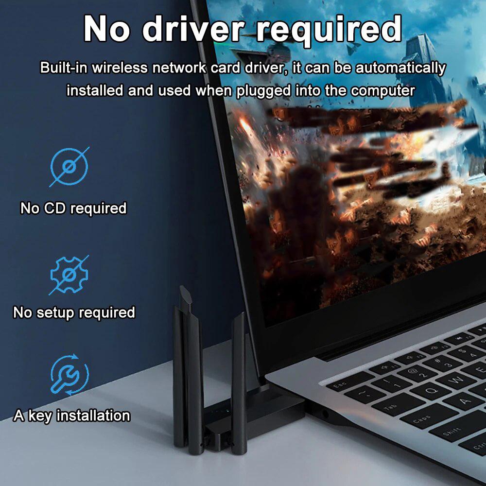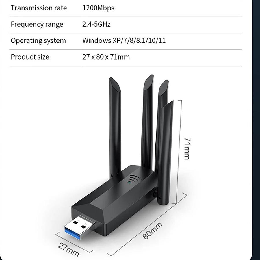 Specifications: Product name: 4 antenna USB network cardAntenna standard: EEE802.11b/g/nTransmission rate: 1200MbpsFrequency range: 2.4-5GHzOperating system: For WindowsXP/7/8/81/10/11Product size: 27 x 80 x 71mmPackage includes:1*1200M 4 antenna USB network card