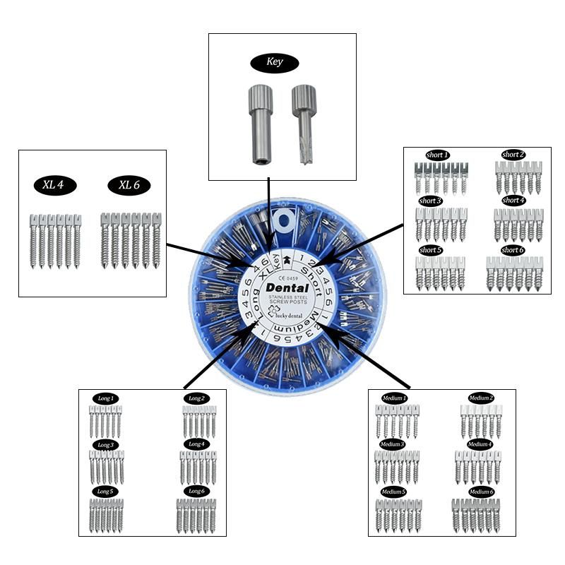 Report ItemDental screw post 120pcs 2keys1, 100% new brand2, stainless teel3, 20types sizes and 2keysyou can choose two type post :1 Silver STAINLESS STEEL screw post 120pcs and 2keys1 Golden plated STAINLESS STEEL screw post 120pcs and 2keys