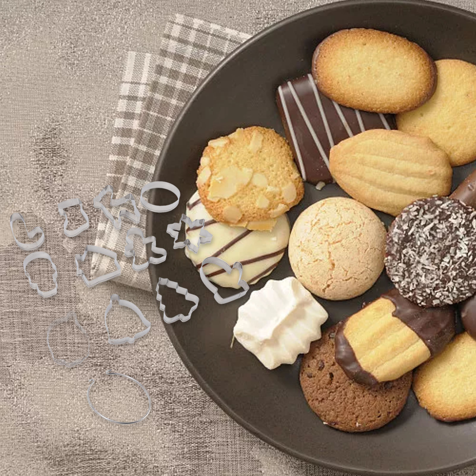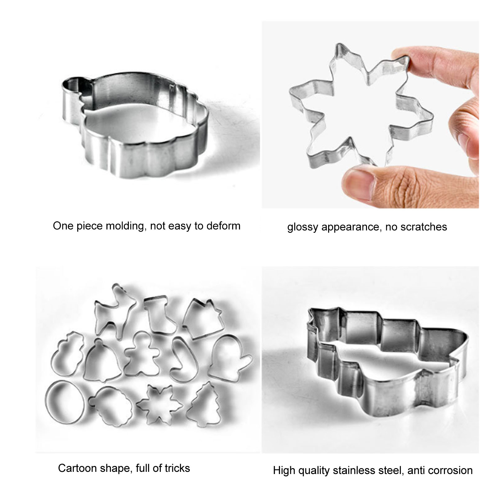 1Edge Folding: Specially designed edge folds to prevent hand injury when pressing, the other side of the cookie mold is glossy and incisive, which can be quickly demolded and keep the shape of the cookie . 2Anti Corrosion: Cutters are very durable, antirust, anti corrosion, not easy to deform, and healthy for your body. It helps you make fun and delicious Christmas cookie cutters. 3Easy to Clean: The Christmas cutter is easy to clean, just wash in hot water, wipe dry, and put it in the dishwasher. 4Better Relationships: Make food for Christmas, winter break or party cookie with our kids to enhance parent child bonding. 5Scope of Application: The Christmas cutter is perfect for cutting cookie dough, fondant, cookie, soft fruit, bread, cakes, sugar, sandwiches, cheese or craft clay.