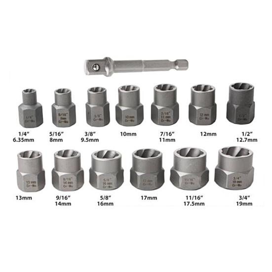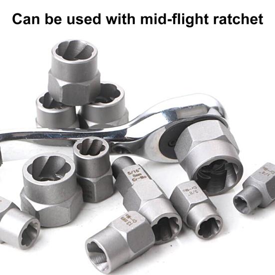 :Featuring a sturdy construction for greater strength and durability, this nut removal tool offers excellent torque with its unique flower-shaped female thread design.A screw extractor for removing broken, stripped and damaged screws and bolts. It removes even the toughest of broken fasteners quickly and efficiently.It is constructed of chrome molybdenum alloy steel material.The length of this product is 17.5cm, the width is 10.5cm and the height is 4.5cm. Nut Extractor is suitable for use at home, in a garage, on a construction site or in a store.Item Name: Nut ExtractorsMaterial: Chrome Molybdenum Alloy SteelFeatures: High Hardness, Sturdy, Safe, Widely UsedSize Details:Size: 17.5cm x 10.5cm x 4.5cm(Approx.)Notes:Due to the light and screen setting difference, the item's color may be slightly different from the pictures.Please allow slight dimension difference due to different manual measurement.Package Includes:14 x Nut Extractors