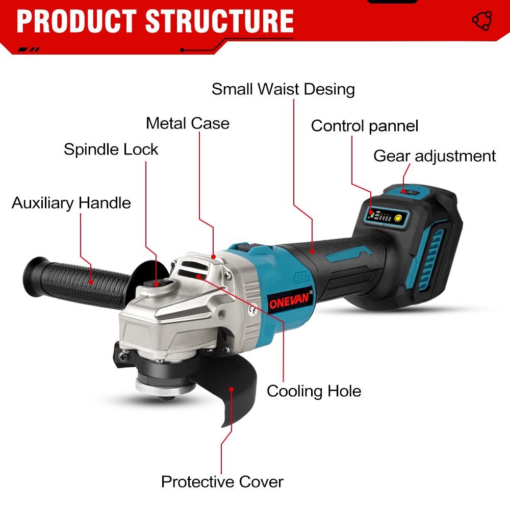 Name:Brushless angle grinderNote:Fir For Makita 18v BatterySpecifications:Material:Alloy+plastic+rubberColor:Blue+blackNo-load speed: 3000-20000rpmGrinding / slicing diameter: 125mmBattery:22900MAH / 588VF (NO Battery)Speed:6 GearsFeatures:-Brushless powerful movement, high temperature resistant copper enameled wire, anti-overload, anti-burning machine.-Thickened cover shield to place spark splash damage.-Enhanced side handle, more stable hands control.-Six gear speed,one second quick change.-Ergonomic design, slim soft body, better fit the palm of your hand, work will be more convenient.Package Included: (without battery type)1 x angle grinder (NO Battery)2 x Accessories