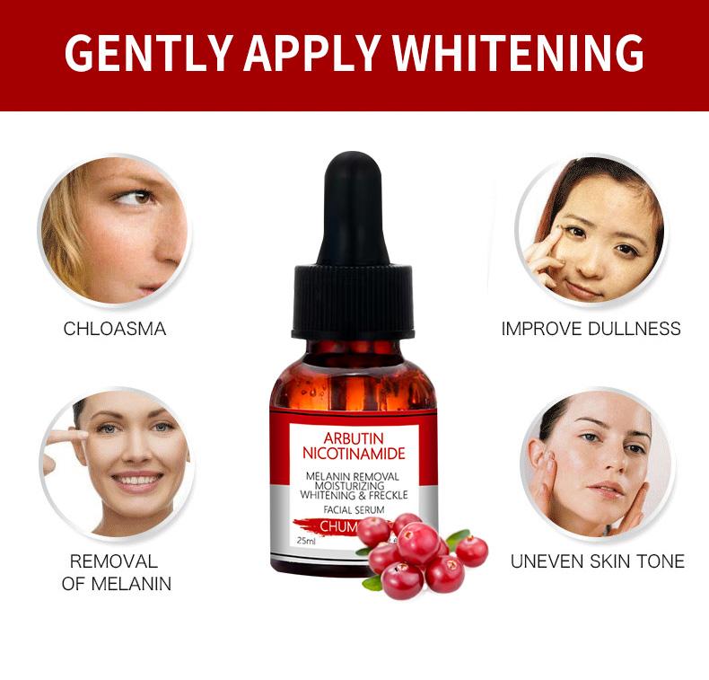 Contain arbutin and Nicotinamide ,can quickly penetrate into the skin, can effectively inhibit the activity of tyrosinase in the skin, block the formation of melanin, and directly combine with tyrosinase to accelerate the decomposition and excretion of melanin. Reduce skin pigmentation, remove spots and freckle,make skin bright and smooth