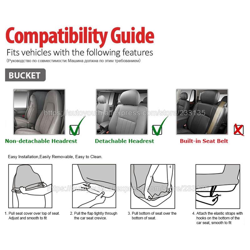 Item Type: Automobiles Seat Covers Item Name: High Back Bucket Seat Covers Suite Number: 2 Pieces Compatible Vehicles : Cover Fits all Standard Car Seats Placement on Vehicle: Front Material :100% PVC Fabric Color: BlackPacking Include:2 x High Back Bucket Seat Covers1 x Bag Hook Accessories