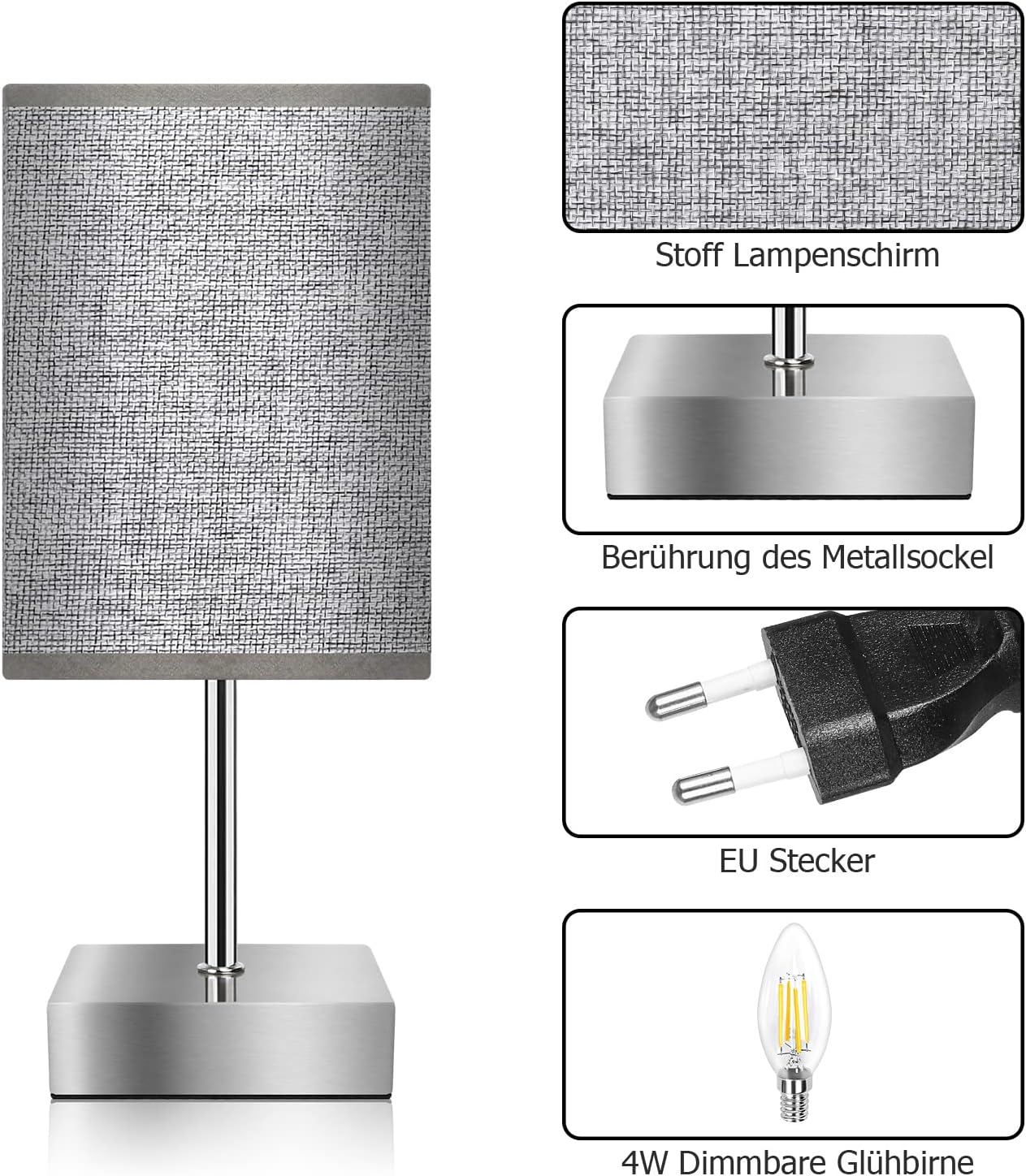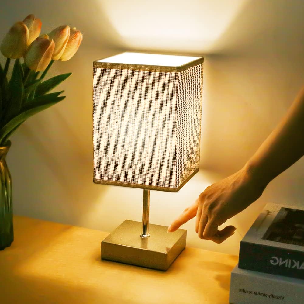 Touch DimmingTap anywhere on the metal base to quickly turn the light on and off. The light is also easy to operate and control when in the dark. The table lamp has 3 brightness levels (low, medium, high) to meet your different lighting needs. Modern and Classic DesignThe gray linen lampshade and silver metal base are a combination of fashion and elegance, enhancing the beauty of the fabric table lamp. It can harmoniously blend with any interior style. At the same time, the 3000k warm tone puts you in a romantic and warm atmosphere. Exquisite and CompactThis mini table lamp measures 11.5*11.5*27cm and looks more compact than regular table lamps. It is perfect for lighting children's rooms, while the linen lampshade provides a softer and more comfortable light. It works perfectly. Easy to UseThe night light is a standard European plug and comes with a 1.4m cable. The touch switch allows you to turn on the table lamp accurately in the dark. Equipped with dimmable E27 bulbs (max 40W). Our modern night light comes with an instruction manual. So you can assemble our products quickly and easily. Attention: Random bulbs. Wide ApplicationSimple design is a beautiful decoration for your home, perfect for bedroom, living room, office, dining room, study, etc. It is also a great gift for friends, lovers and family. 1 2 3