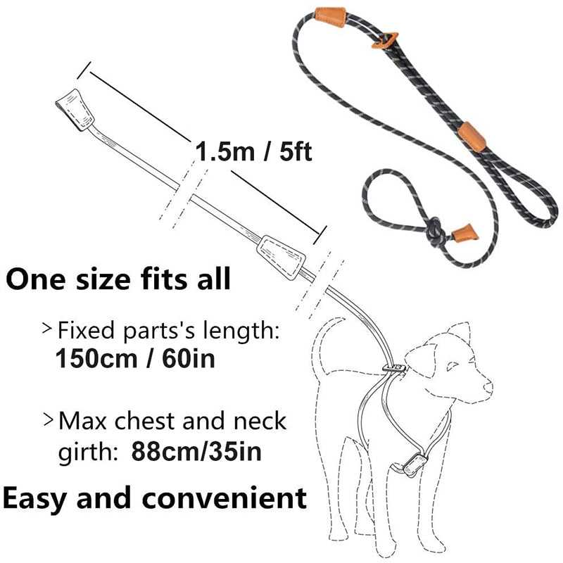 Perfect Length for Walking-The leash is about 5 feet, has the right thickness, and adjustable length to feel comfortable on your hand and do not hurt your dogs neck if he pulls suddenly, giving enough comfort and freedom to your dog.