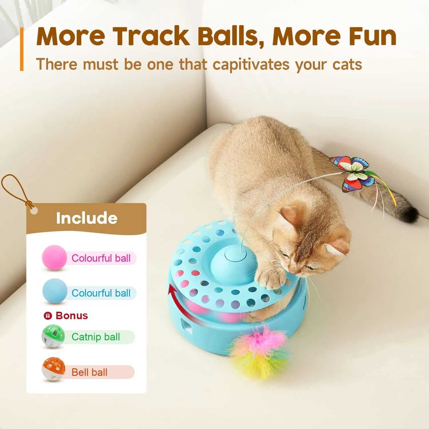 [3 in 1, Most Versatile Cat Toy Ever] – shooting feather from random holes, flying butterfly and balls in the track. The fluffy feather keeps hiding and popping out from random holes, unpredictable movement stimulates cats to swat and play like a whack-a-mole game. Lifelike butterfly that flaps around in the air like real easily prompts cats to pounce and bat. The 4 balls which you can put in the track add extra fun when cats stick their claws into the track and bat the balls