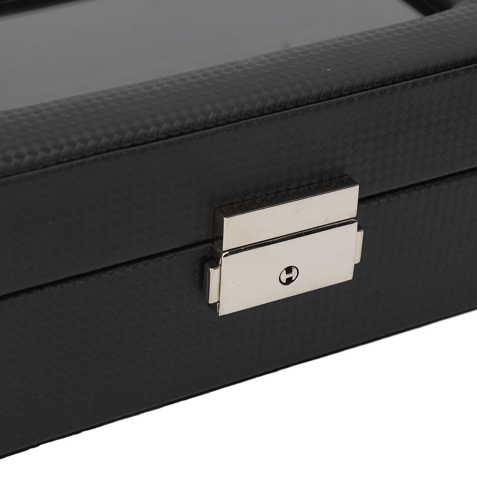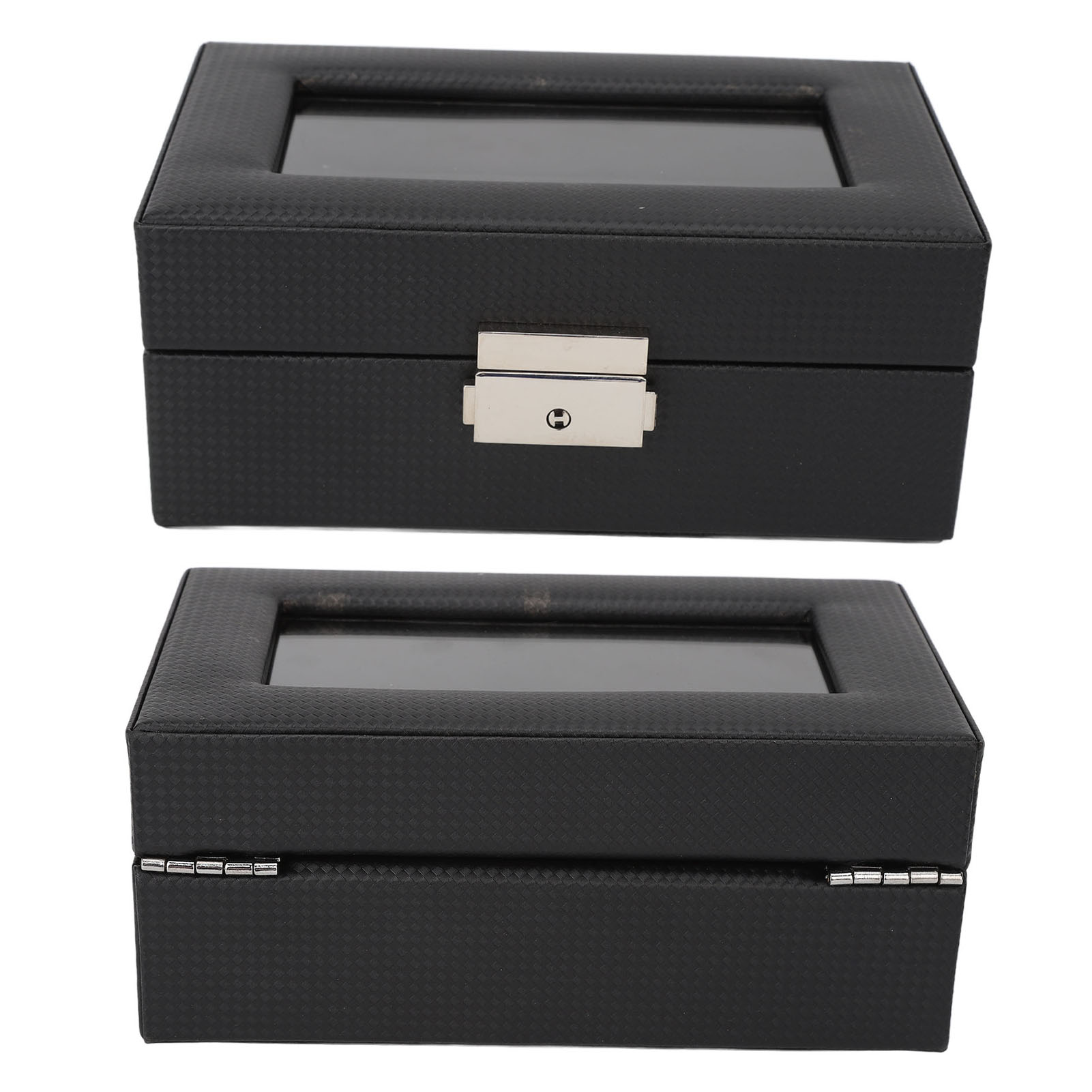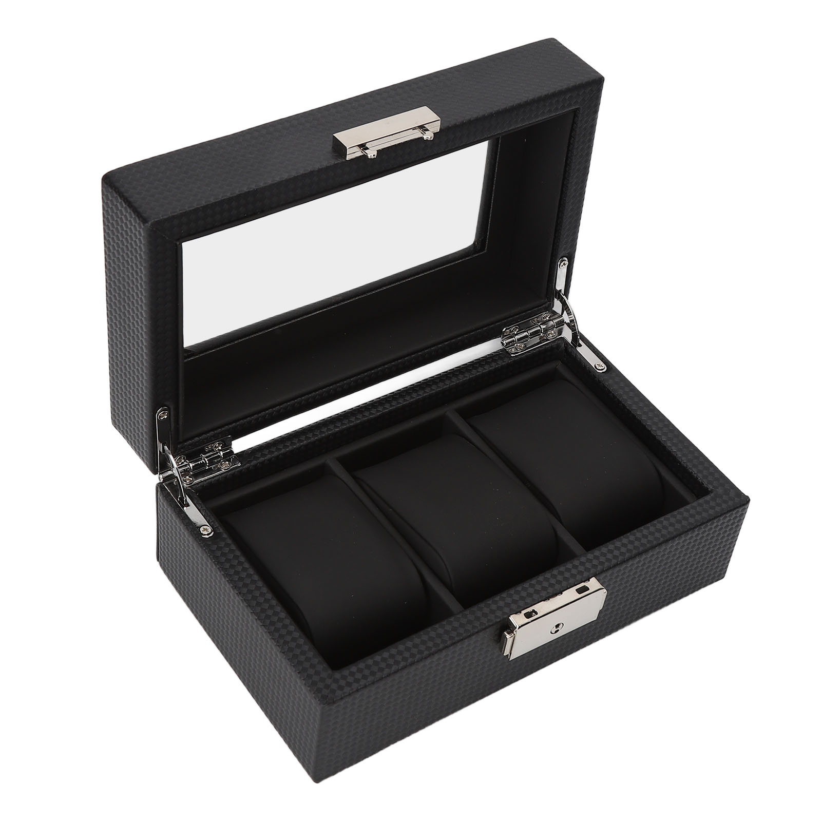 1Transparent Window: 3 slot watch box using 0.3cm/0.12in thickened acrylic window, high strength transparent, the interior is visible, easy to clean. 2PU Leather Outer Layer: 3 slot watch case outer layer selected premium carbon fiber black PU leather, soft touch, high elasticity and non deformation. 3Safety Protection: Soft and tight watch box slot, the surface layer is flexible and comfortable to feel, better guard your watch from damage and scratches. 4Exquisite Gift: This watch display box is elegant, perfect for individual use, store display and home decoration. Ideal gift for birthday, Valentine's Day, holiday. 5Portable Size: 3 slot watch storage box is designed for wearing your watch or various jewelry on long or short trips, and can easily fit in your luggage.