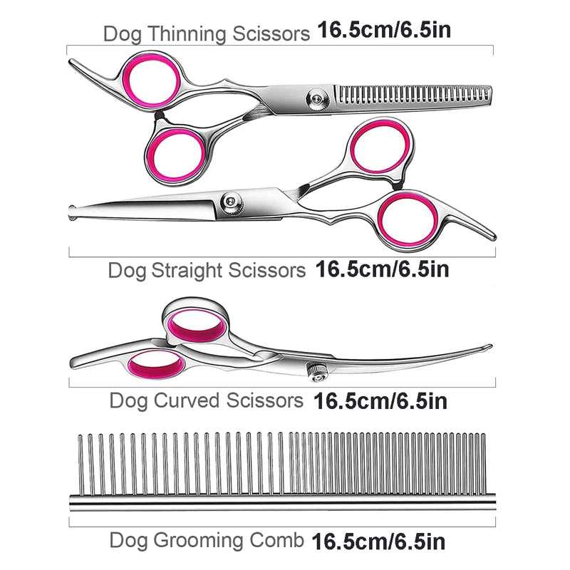 【PERFECT PET GROOMING SCISSORS KIT】: Pet grooming scissors kit includes 6.5-inch thinning shears, 6.5-inch curved scissors, 6.5-inch straight scissors, a grooming comb, a cleaning cloth, and stylish black leather case. So it can trim any part of your pet such as the body, face, nose, ear, tail, paw, etc.