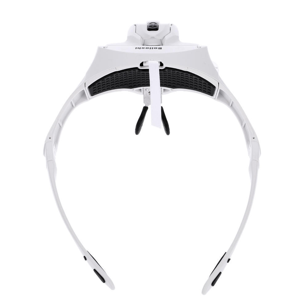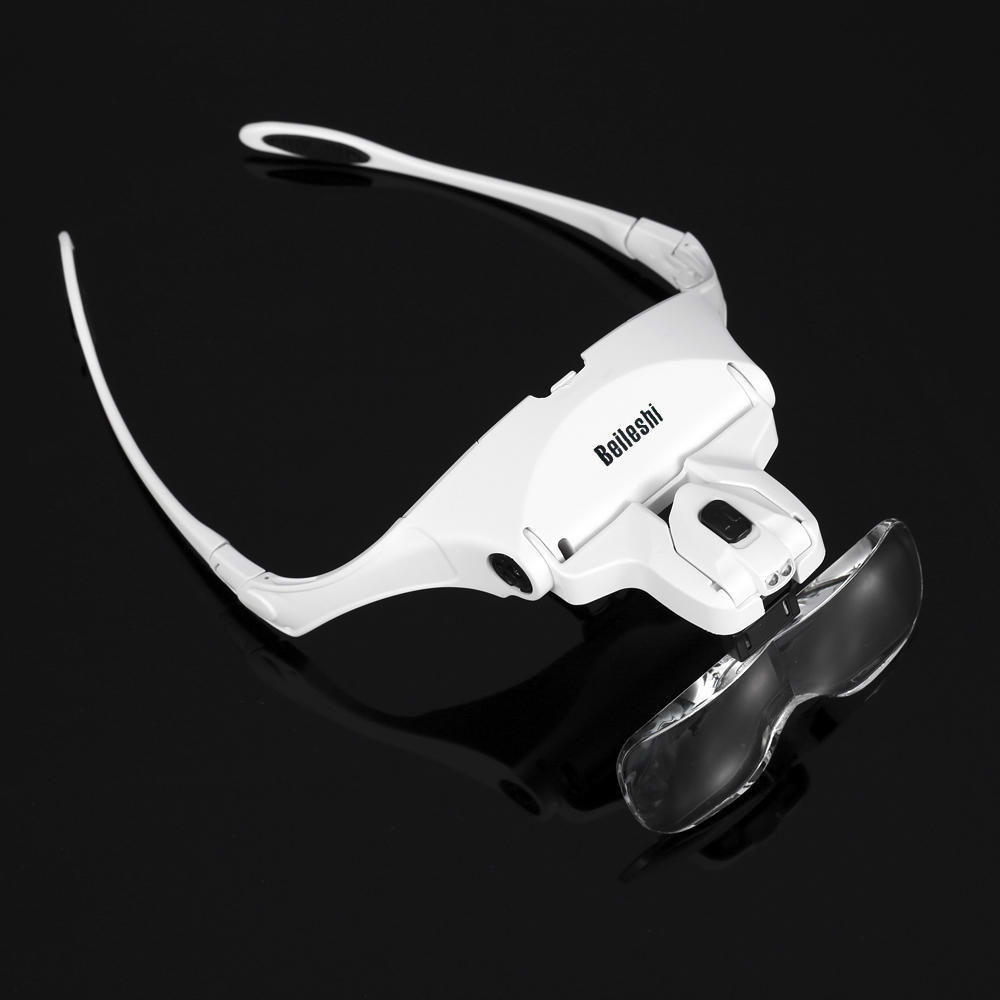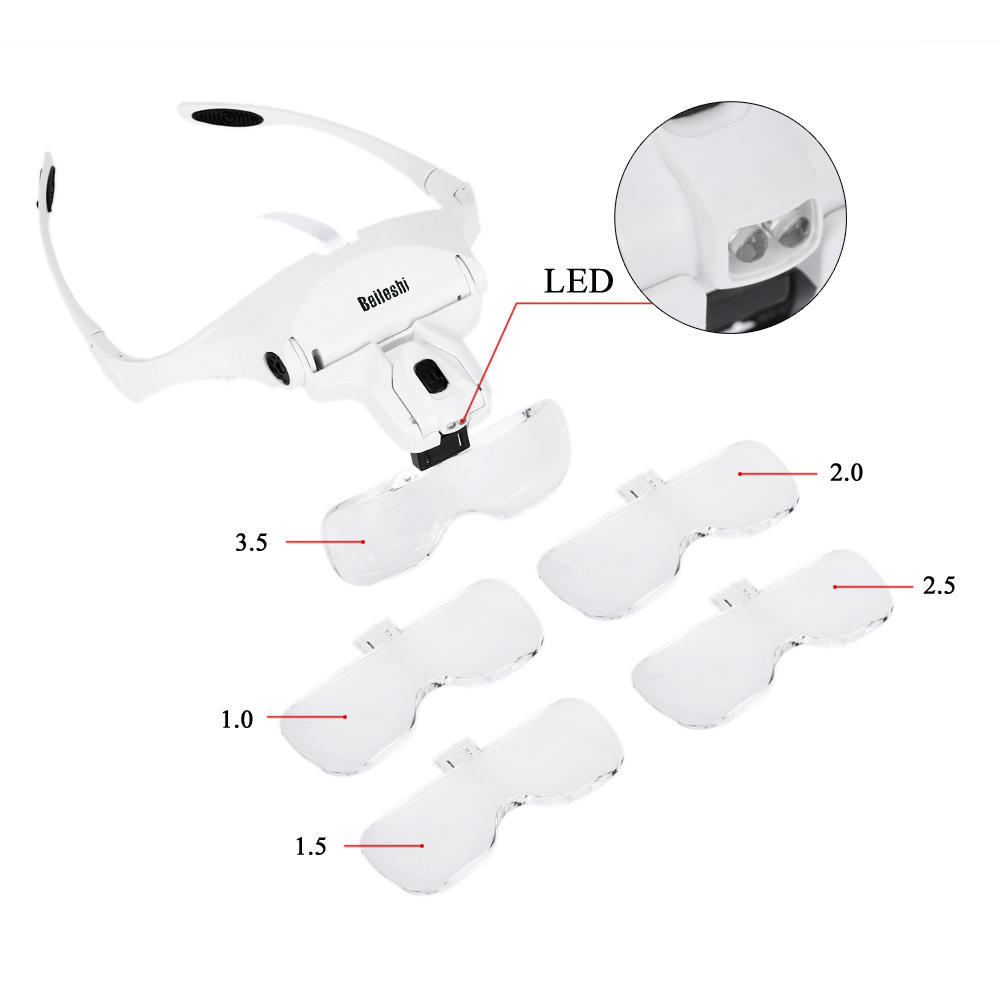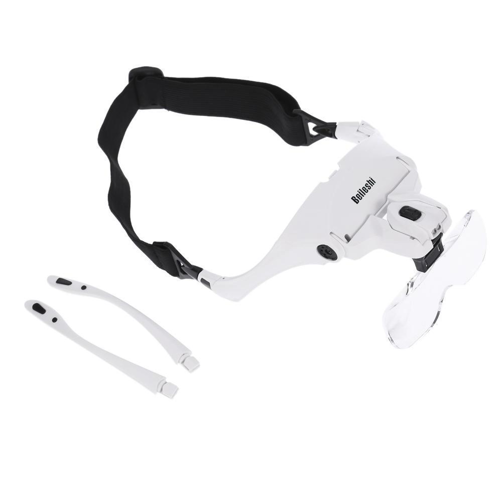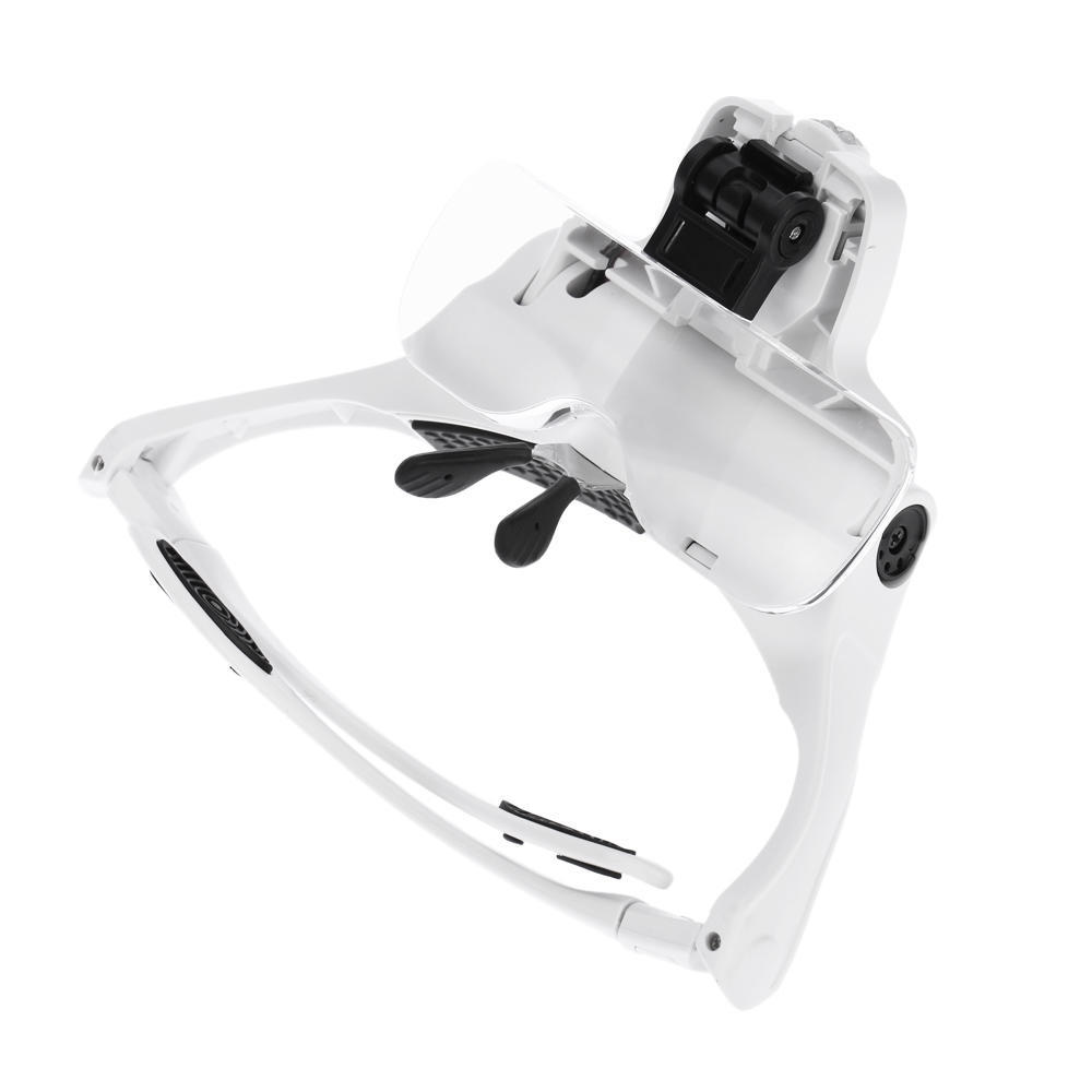 This innovative glasses type magnifier, with bracket and headband and 2 LED lights, can be easily used for reading books, reading newspaper, drawing, handicraft, tailoring, viewing flowers and plants, and so on. The bracket and headband is interchangeable in use. In addition, five kinds of lenses with different magnifications are available for your alternative use.Features:Glasses type magnifier with 2 LED lights, convenient for use.Come with glasses bracket and headband for interchanging.Widened lens can enlarge visual range.Five kinds of lenses with different magnifications are available.Moveable lens slot is used to adjust the focal length between lens and object.It can be used under insufficient light with the 2 LEDs.Lighting angle is adjustable, too. Good magnifying tool for reading books, reading newspaper, drawing, etc.Specifications:Color: WhiteMaterial of Lens: Acrylic LensMaterials of Frame: ABS + PP Battery: 3 * AAA Batteries (Not included)Lens: 1.0X / 1.5X / 2.0X / 2.5X / 3.5XSize of Lens(1pc): 95 * 34mmItem Weight: 57g / 1.98ozPackage Size: 21 * 15.5 * 6.5cm / 8.3 * 6.1 * 2.56in Package Weight: 340g / 12ozPackage List:1 * Magnifier1 * Headband5 * Lens(1.0X, 1.5X, 2.0X, 2.5X, 3.5X)1 * Lens Box 1 * User Manual(English)