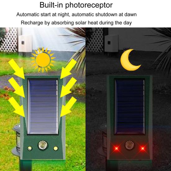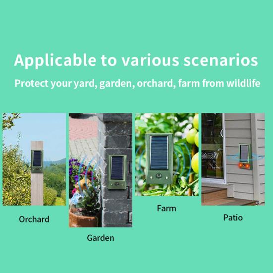 Description:When the animal repellent detects an animal's movement, it will emit an alarm, a strobe light and an ultrasound to scare the animal away.With this animal repeller, you can effectively repel animals, such as cats, dogs, wolfs, rats, squirrels, rabbits, birds, deer, raccoons, mice, and so on.It is constructed of ABS material.The length of the animal repeller is 11cm, the width is 5cm, and the height is 2cm.It is perfect for farms, gardens, lawns, patios, manors, orchards, etc.Item Name: Animal RepellerMaterial: ABSColor: GreenBattery Capacity: 500mAhFeatures: Double Blinking LED Light, Waterproof, Solar PoweredSize Details:11cm x 5cm x 2cm(Approx.)Notes:Due to the light and screen setting difference, the item's color may be slightly different from the pictures.Please allow slight dimension difference due to different manual measurement.Package Includes:1 x Animal Repeller