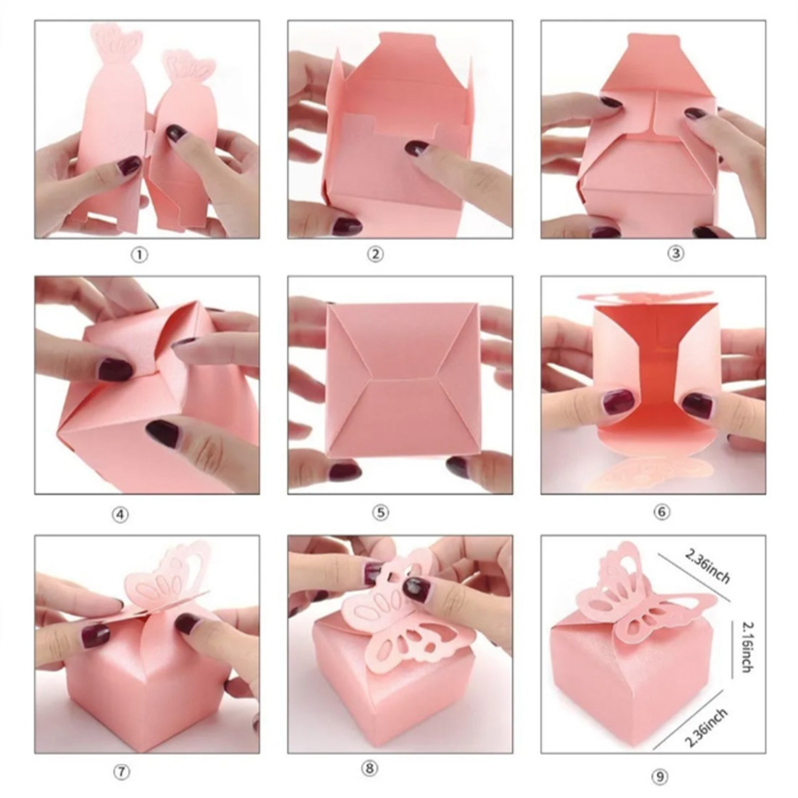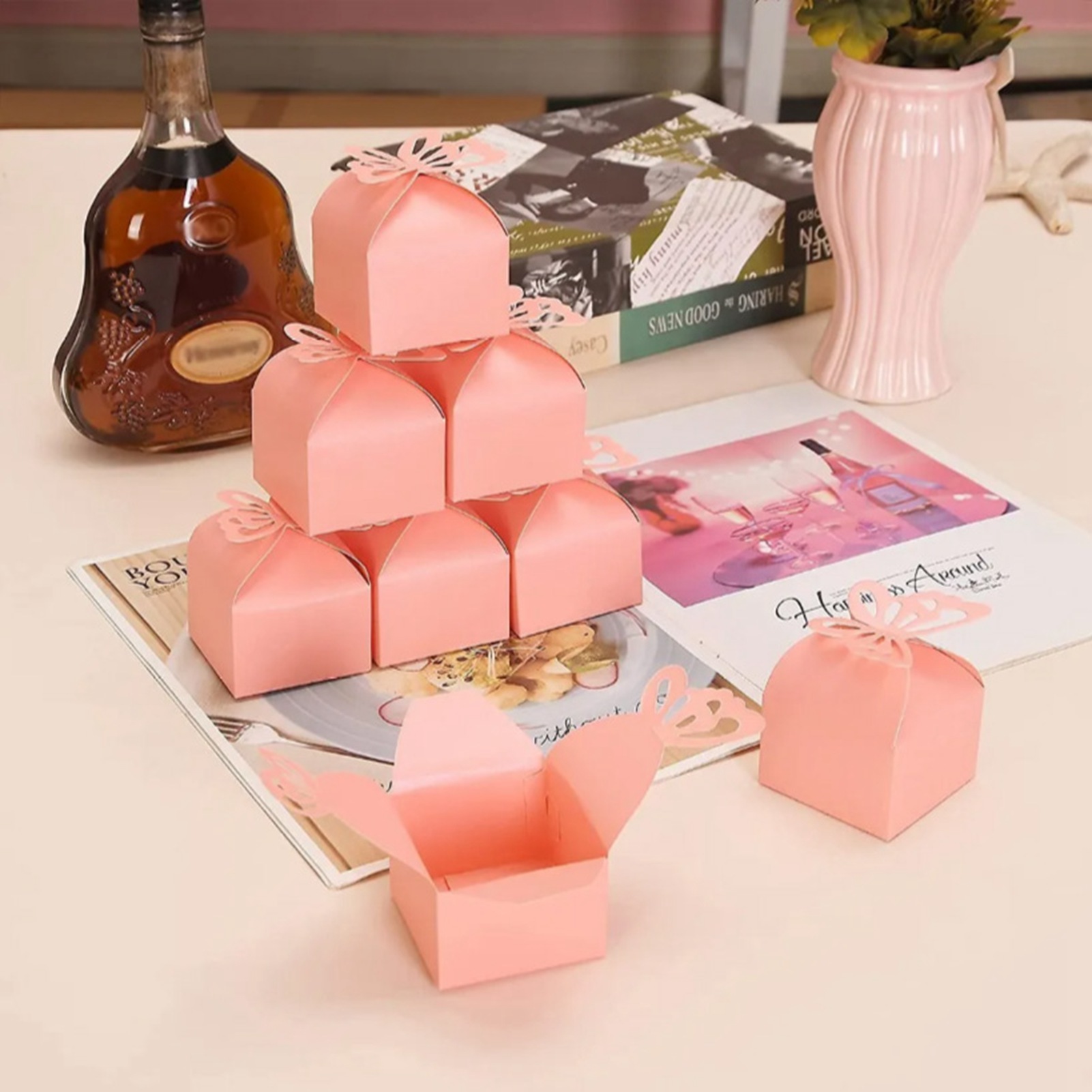 1Beautiful Decoration: 3D butterfly shape with soft pink color makes the favor box to be a bright decoration on table for your party or celebration. 2Easy to Assemble: All butterfly party favor boxes come in flat packaging that requires you to assemble yourself and can be easily opened and folded without glue. 3Create A Holiday Ambience: Pink butterfly candy treat boxes can create a good holiday ambience and leave unforgettable memories for your kids and guests. 4Top Handle and Enough Space: Pink butterfly gift boxes adopts butterfly shaped top handle, easy to carry for guests, and it has enough space to hold snacks, cookies, candy, chocolates and more. 5Wide Application: These gift boxes are very exquisite, suitable for butterfly themed party, kids' butterfly birthday party, butterfly baby shower, bridal shower, weddings, Thanksgiving, Children's Day, Christmas, ceremonies, anniversaries, etc.
