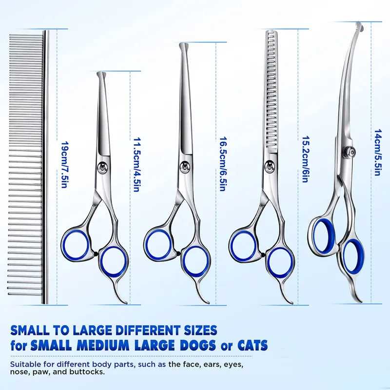【6 in 1 Dog Grooming Scissors Set】The dog grooming scissors set comes with 2 straight scissors, 1 thinning scissor, 1 curved scissor, 1 grooming comb, and 1 storage case