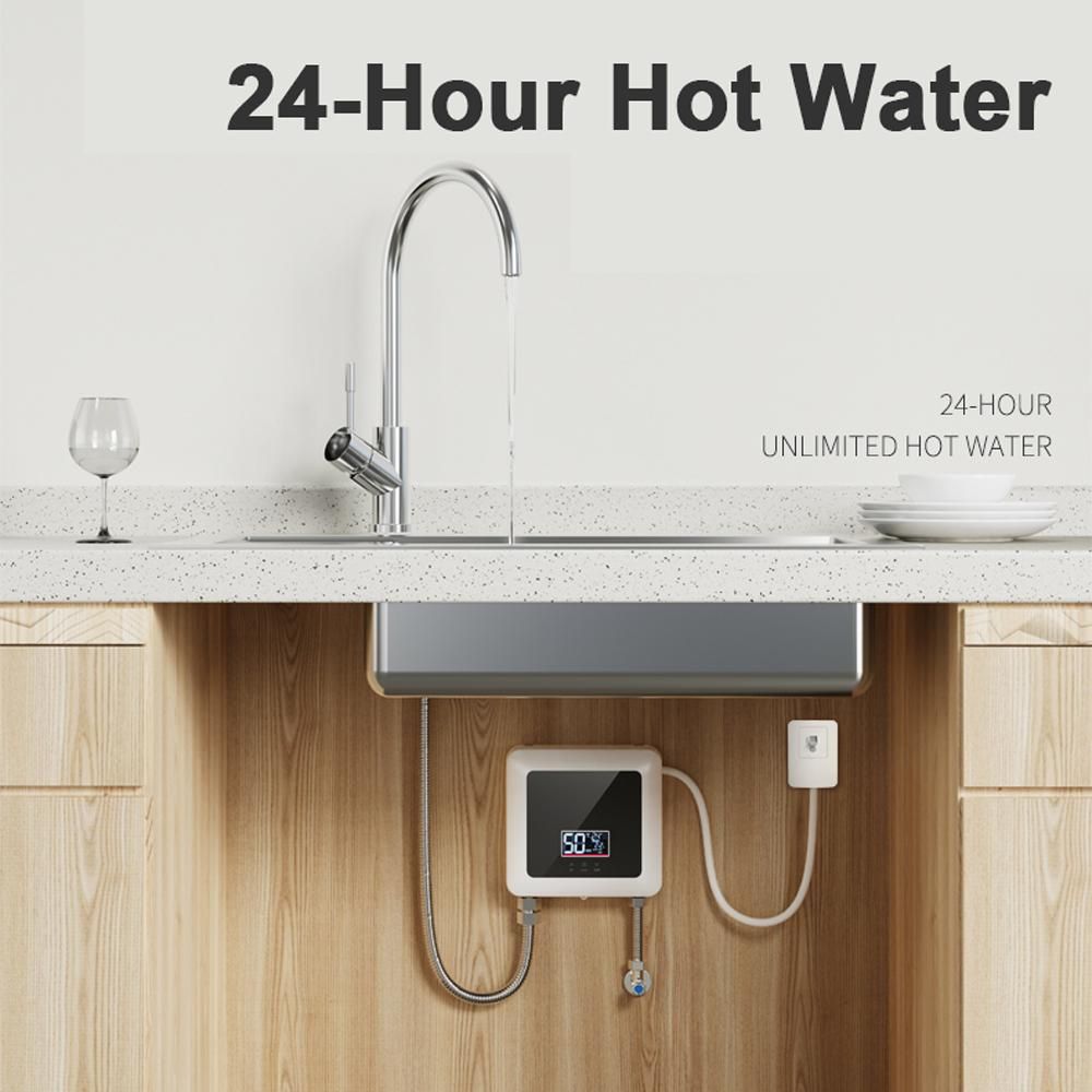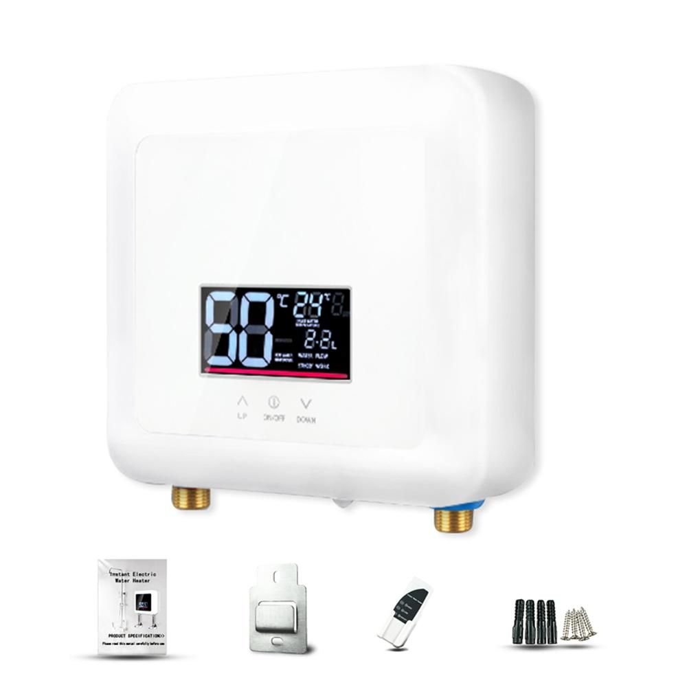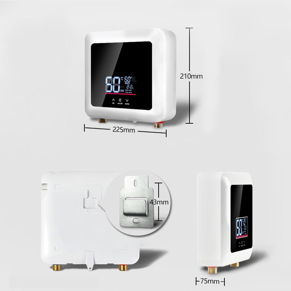 Instant electric water heater, intelligent frequency conversion design, low power consumption, energy saving and electricity saving. 30-55 celsius wide temperature adjustment, support touching and remote control, easy to use. It is very suitable for installation in kitchens, bathrooms, schools, hospitals, etc. It can guarantee 24 hours of hot water without waiting.Features:24-Hour Hot Water: High-power instant electric water heater can guarantee 24-hour hot water without waiting. 30-55 celsius wide ranges of temperature adjustment to meet the hot water needs of the whole family.Multiple Protections: Built-in multiple protections, anti-drying burning, water and electricity separation, grounding protecting, over-voltage protecting, anti-scalding protecting, over-temperature protecting, fault self-test, etc.Low-Pressure Operation: Using high-sensitivity water flows sensor, 0.04MPA low water pressure starts, even in high-rise buildings, old communities or during peaks water consumption period can be used normally.Thermostat Mode: In thermostat mode, the temperature can be set through the touchscreen button, and after the setting is completed, the heater will output the appropriate power according to the set temperature.Power Adjustment: The electric water heater supports 5 power adjustment, each level is about 20percent of the total power, easy to switch to ensure a stable output of power.Reliable Quality: Adopts high-quality cast aluminum heating body, water and electricity separation, no scale, no leakage of water and electricity, safer to use. Brass water inlet and outlet, high temperature and corrosion resistance, nice stability.Easy to Use: Small size, does not take up space, can be installed in the kitchen, bathroom, washstand, school, hospital, etc. Support touching and remote controlling, easy to operate, convenient and practical.Specifications:Color: White/ Black(optional)Material: ABS + MetalPower: 110V-5500W / 220V-7500W(optional)Applicable Water Pressure: 0.04-1.2MPaWaterproof: IPX4Item Size: 225 * 210 * 75mm/ 8.9 * 8.3 * 3.0inItem Weight: 2.35kg/ 5.2lbPackage Size: 310 * 280 * 110mm/ 12.2 * 11.0 * 4.3inPackage Weight: 2.5kg/ 5.5lbPacking List:1 * Water Heater1 * Remote Controller4 * Screw1 * Installation Holder1 * User Manual