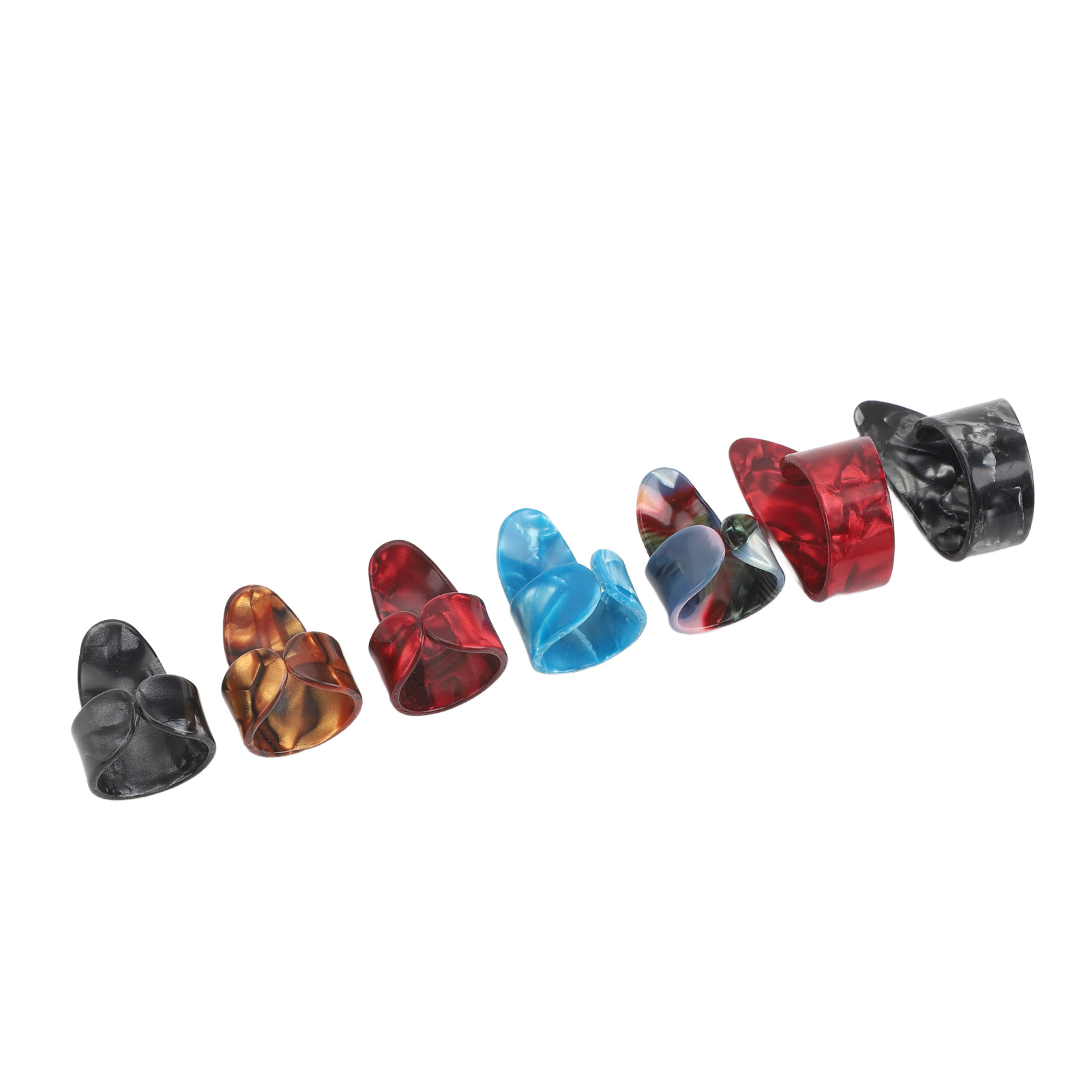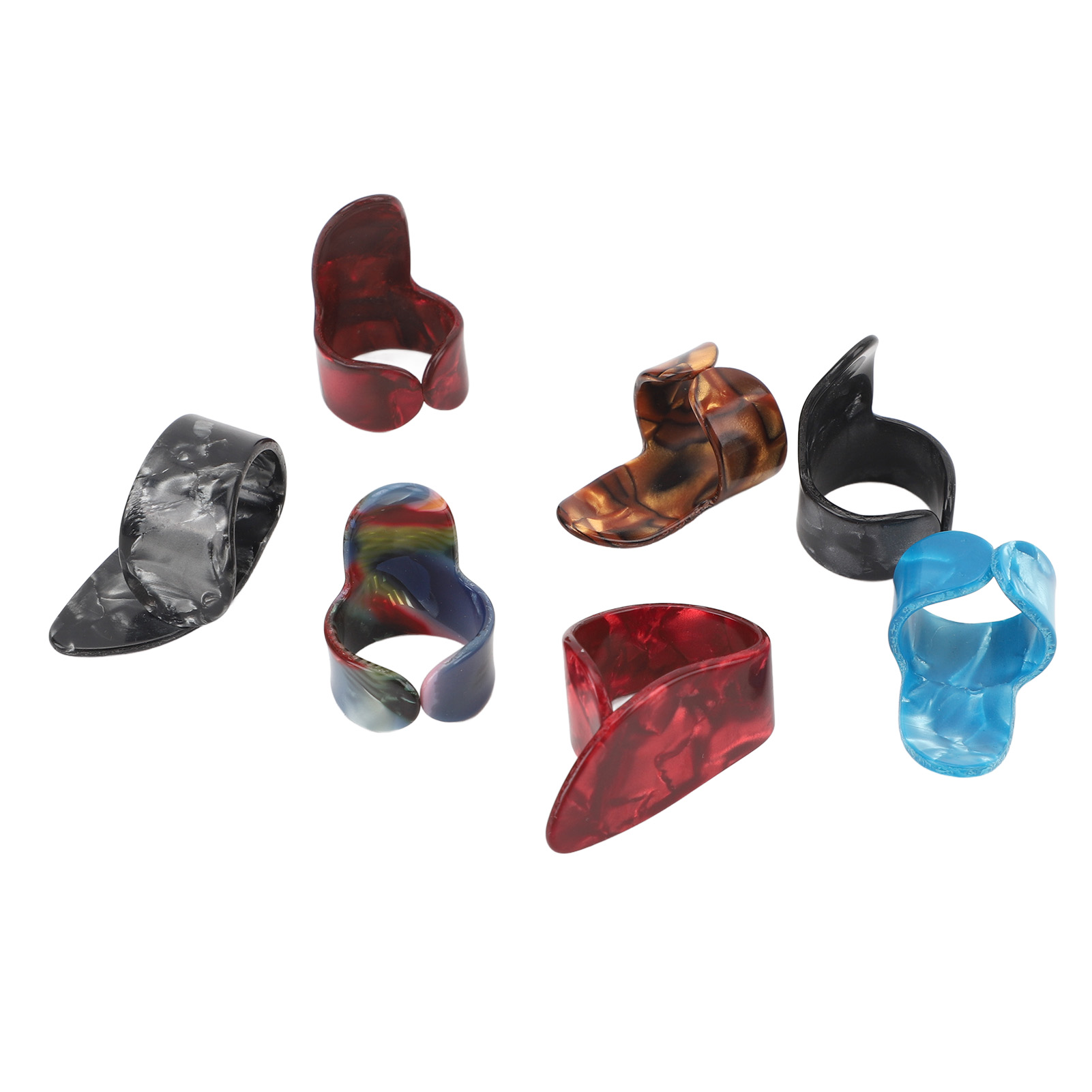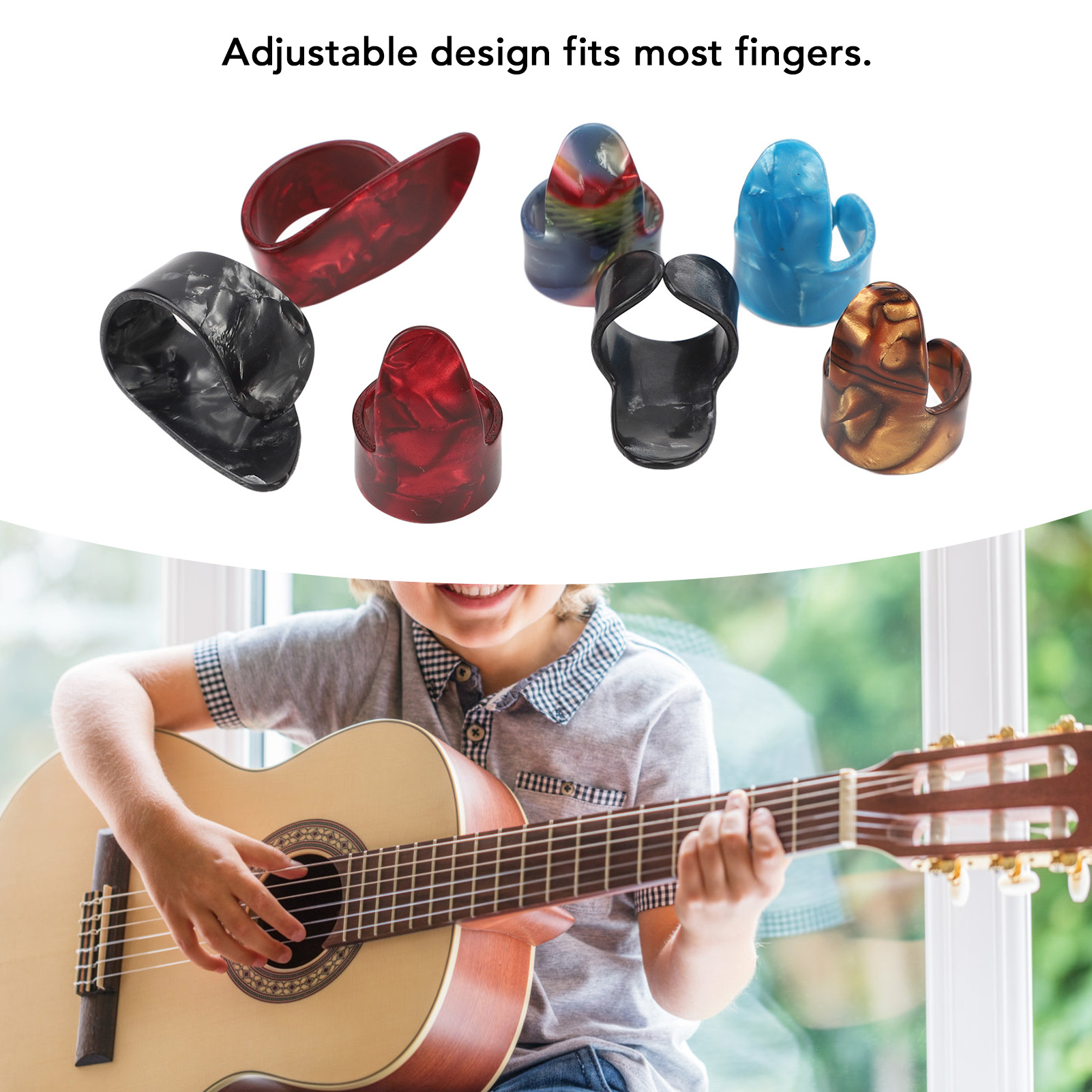 1Adjustable: Are you bothered by the fact that your thumbtacks don't match the size of your fingers? Our thumbtacks are made of celluloid material and can be easily resized, the adjustable design fits most fingers. 2Slick Surface: The slick surface of the thumbtack makes it comfortable to wear.The slick surface and neat edges prevent finger injuries and reduce finger discomfort during long practice sessions. 3Celluloid Material: The thumb plectrum for guitar is made of celluloid material, strong and durable, not easy to deform, good performance and long service life. Great for protecting nails from damage. 4Bass Practice: The guitar thumb plectrum is suitable for guitar bass practice, which helps you to improve your efficiency and playing level, it is a good present for guitarists and music lovers. 5Widely Use: The thumb picks are suitable for guitar and many other stringed instruments, can quickly and effectively enhance the bass sound of the guitar, is a practical accessory to help practice guitar and improve your playing level.