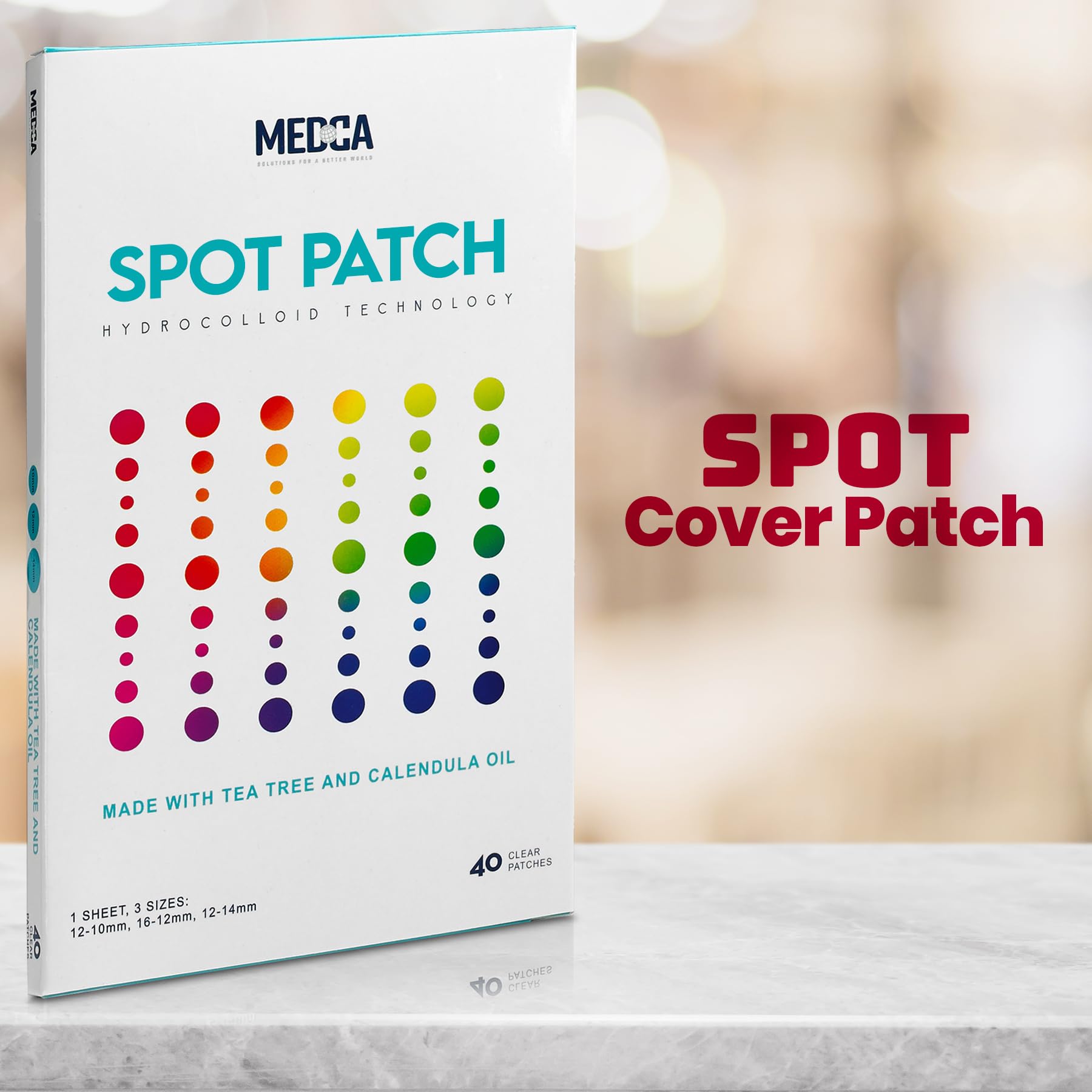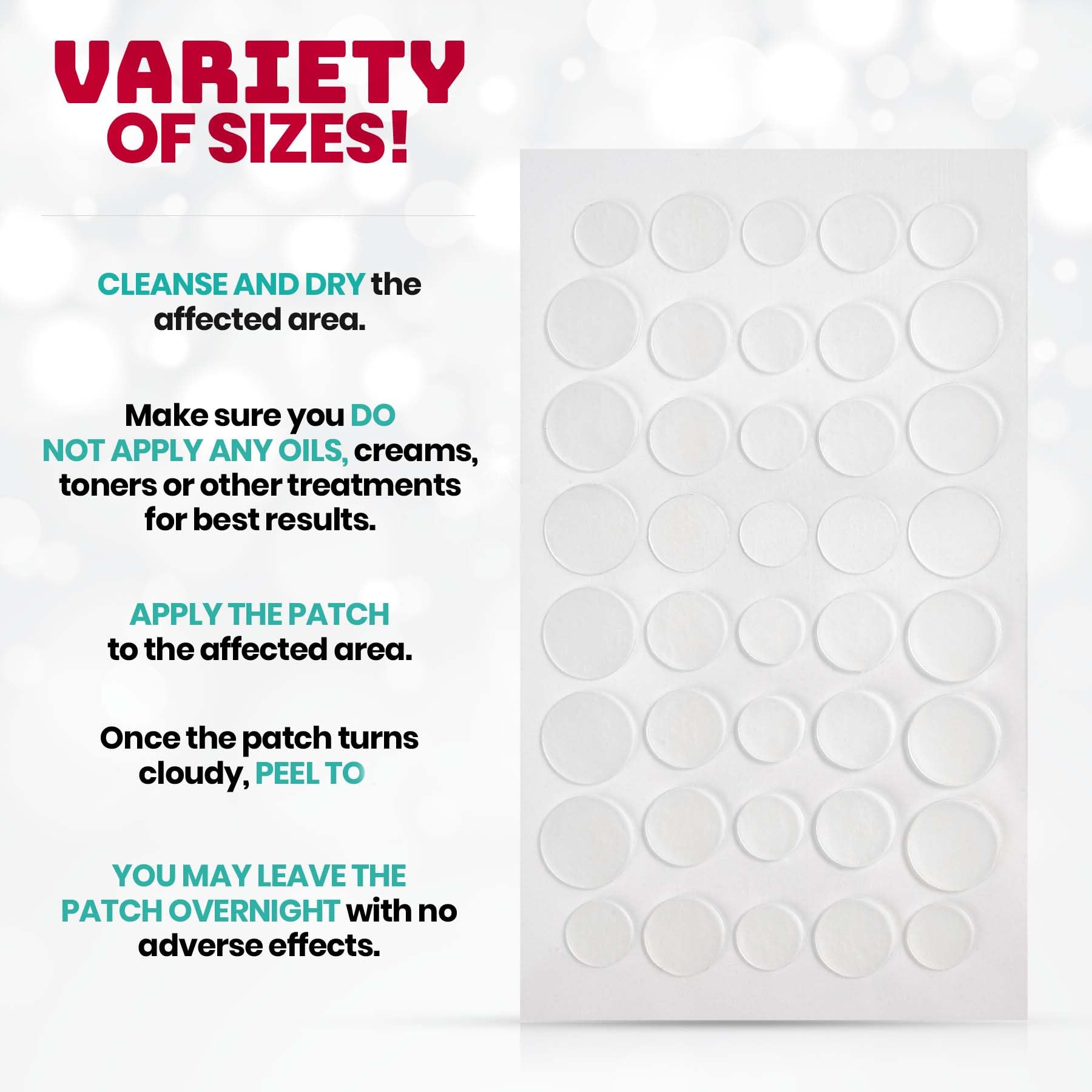 Make Pimples & Zits Disappear with Our All-Natural Acne Pimple Patches ! Don't you wish you can make your acne disappear? Well, you can! With our Acne Absorbing Cover Patches, you can make unwanted blemishes nearly invisible! All-Natural Ingredients Stop worrying about acne and treat it with our all-natural pimple spot remover. Our MEDca cover patch has Hydrocolloid, CICA, Tea Tree and Calendula Oil. Combining all these ingredients produced a non-drying, highly absorbent formula that will restore your skin back to its beautiful self. The pimple patch also protects it from dirt and debris and unnecessary pricking and popping. Easy to Use The acne patch goes on clear that it easily blends with all skin types, suitable for all ages. Go through your daily routine without worrying anyone would notice it because our cover patch is thin and transparent. They also come in a variety of sizes to choose from that best suit your needs. The re-sealable packaging keeps it clean from dirt and dust that you can bring it anywhere with you to help contain those breakouts. Key Features: Pack of 40 Patches All-Natural Ingredients Easy to Use - Peel & Stick Resealable Package Variety of Different Sizes: 12 pcs-10mm, 16 pcs-12mm, 12-pcs 14mm Invisible & Comfortable Blends in with all skin types Best Value in Spot-Free Acne Care! Our acne cover pack includes 40 acne sticker patches in a variety of 3 different sizes.