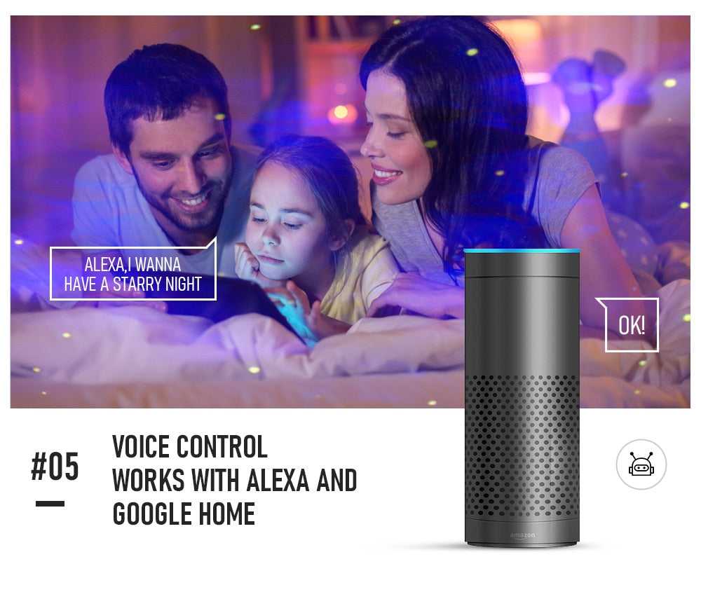 The led galaxy projector lights for room works with Alexa and Google Home. Send a voice command to get the galaxies projector to work, saying "Alexa, turn on/off the galaxy lights projector", "change the color to blue", "set the brightness to 50%", let you enjoy the hands-free experience and the beautiful starry sky view anytime.