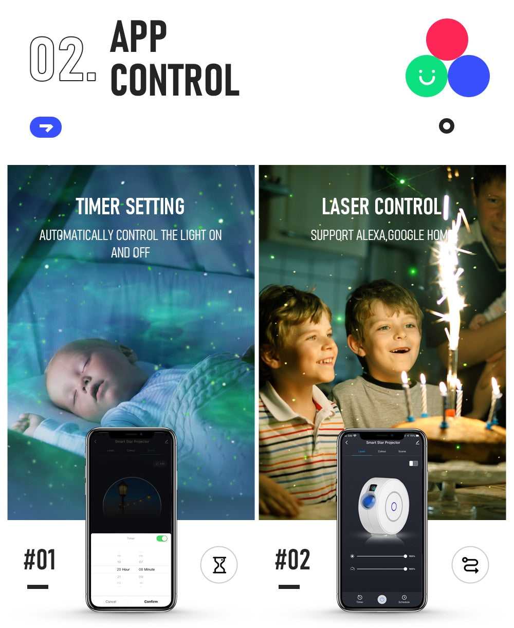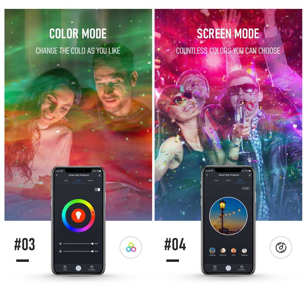 The room light night sky projector have two control modes: "Manual mode" and "App mode" . With the App mode ,you can control the sky light laser galaxy projector via Smart Life APP on your phone, You can choose a variety colors, adjust brightness , Set different color scene, adjust the moving speed of the galaxy nebula cloud,Set the timing according to your needs. (Notes: 2.4Ghz Wifi Network only)