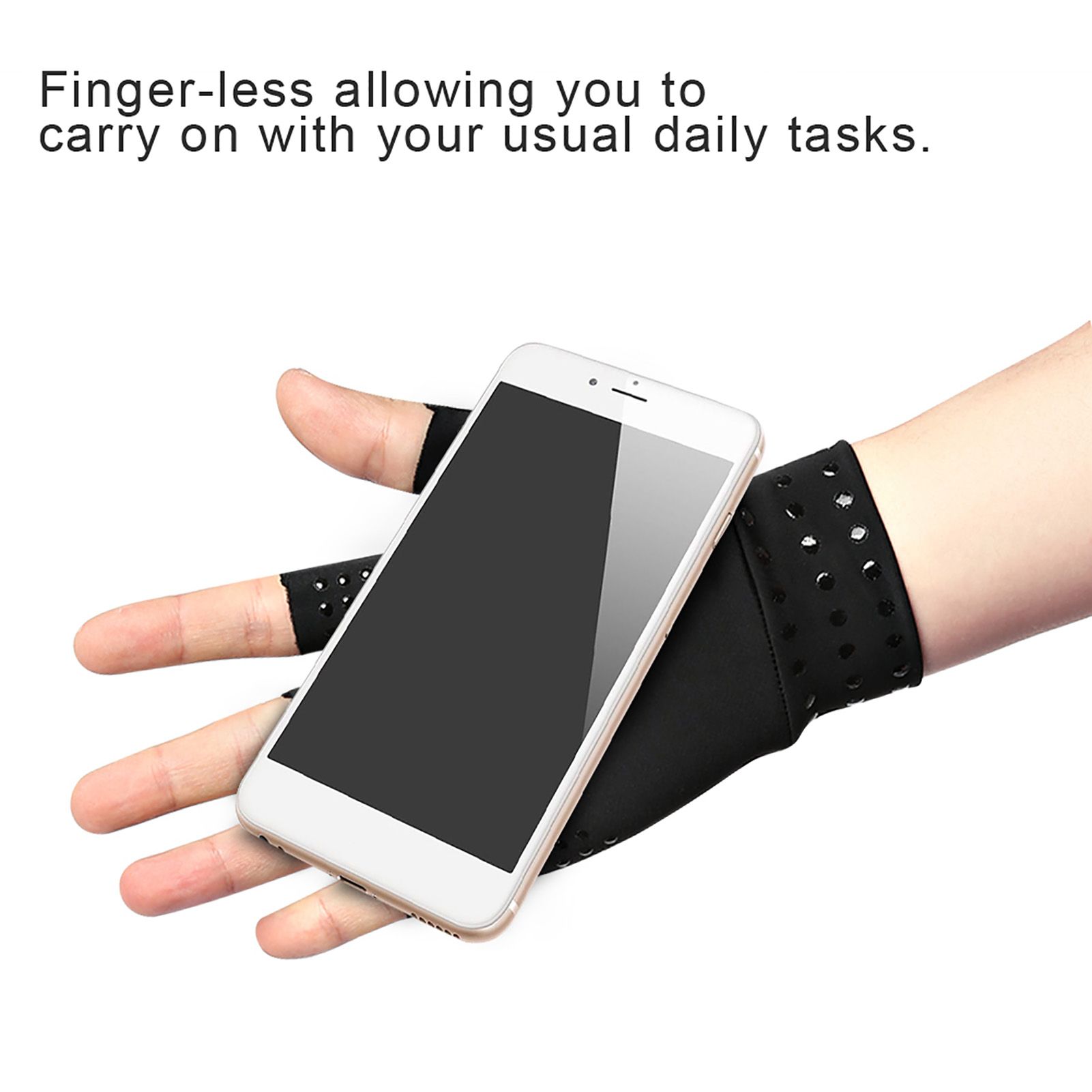 1Finger-less allowing you to carry on with your usual daily tasks 2Cuff design can maximize the flexibility of the wrist 3Relax muscles and every joint 4Warmth and compression gives relief from aches, pains and inflammation 5Made of nylon, breathable and keep the palm of the hand temperature and dryness