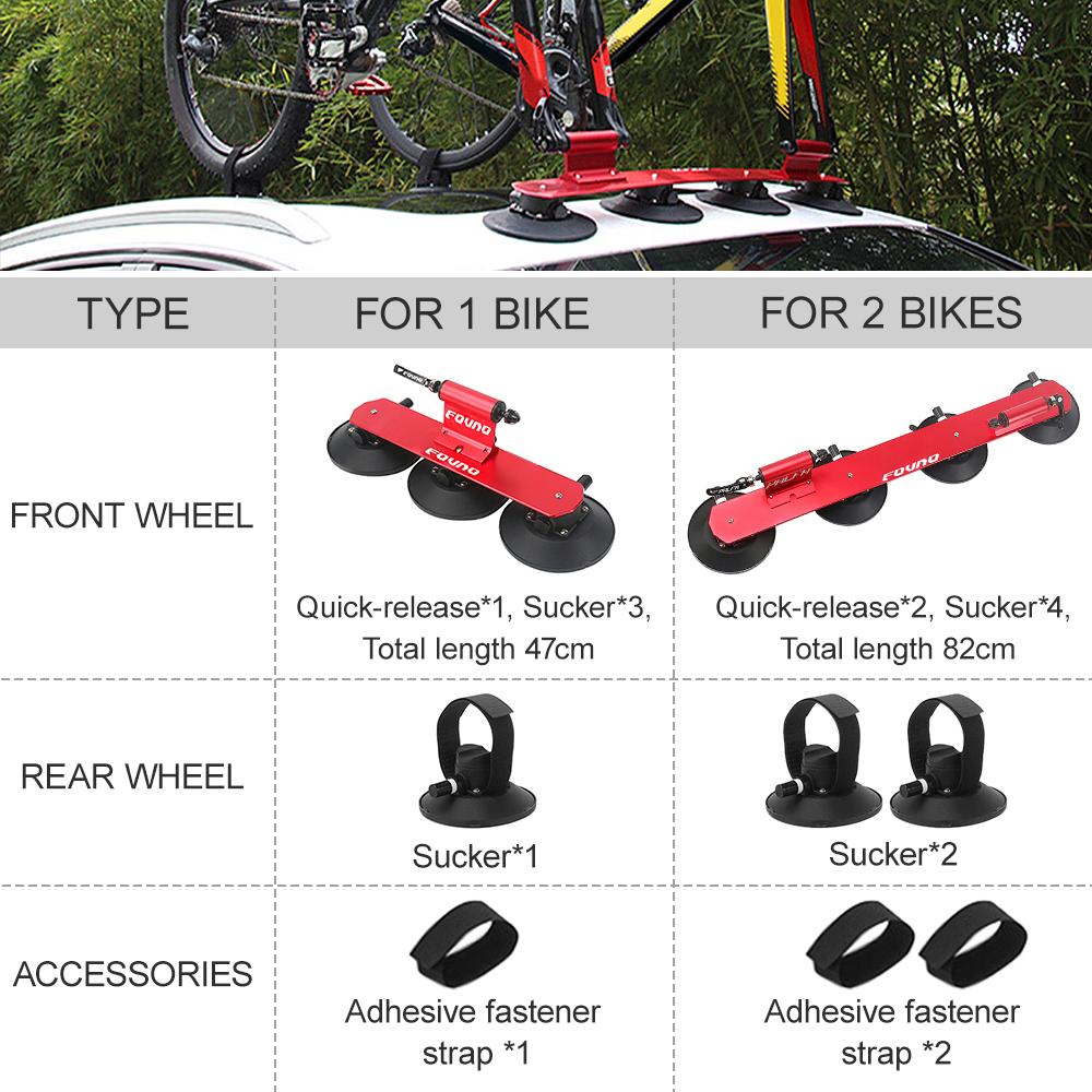 This bike carrier rack is made from aluminum alloy and rubber sucker. It is easy to install and carry your bike on the car roof top.Features:Made from aluminum alloy, sturdy enough to hold your bike.Rubber sucker protect your car paint from scratches.Fixing straps help keep the bike crank and rear wheel in place.Easy to install and take off, can be used on most vehicles like sedans, coupes, SUVs, vans, etc.Fits road bikes, mountain bikes, or any bike with quick release front fork.Note: 1. Please keep your driving speed below 120km/h.2. Check the sucker every 4 hours to prevent air leakage.Specifications:Material: Aluminum alloy + RubberColor: Black / Red (optional)Type: For 1 bike / For 2 bikes (optional)For 1 bike:Total Length: Approx. 47cm / 18.5inPackage Size: 49 * 21 * 17cm / 19.3 * 8.3 * 6.7inPackage Weight: 2.1kg / 4.6lbFor 2 bikes:Total Length: Approx. 82cm / 32.3inPackage Size: 84 * 21 * 17cm / 33.1 * 8.3 * 6.7inPackage Weight: 3.4kg / 7.5lbPackage List: (For 1 Bike)1 * Bike Rack1 * Suction Cup1 * Fastener Strap
