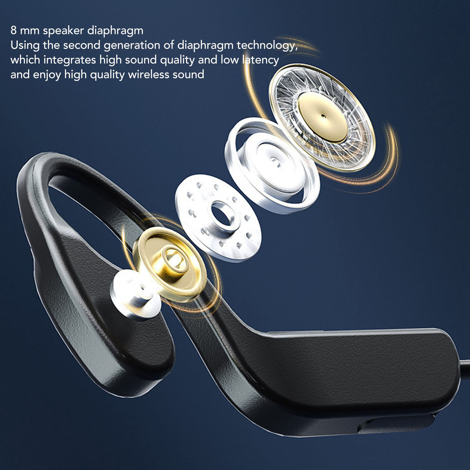 1Bluetooth 3: The bone conduction headphone uses Bluetooth 3 for a stable connection and a transmission distance of 10 meters or more. 2High Performance: Open ear wireless headset features second generation vibrating membrane technology with integrated high sound quality and low latency. 3Memory Titanium Alloy: Bone conduction sports headset adjusts its shape to fit different head sizes and is less likely to fall out. Let the music into your life journey. 4Comfortable to Wear: Bone conduction wireless headphone uses bone conduction technology, no need to enter the ear, comfortable to wear. 5Long Battery Life: Bone conduction bluetooth headset is upgraded to a powerful range with 300 hours of hardcore battery life, focused on sports and gaming.