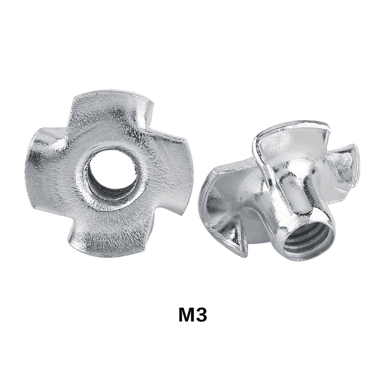 1These four-pronged T nuts are made from carbon steel and plated with zinc for rust and corrosion protection 2These nuts are used to provide a strong, reliable and easy to fit threaded socket in wood and chipboard 3These four prongs will stop the T nut from turning when they are inserted and tightened into wood pieces 4There are 5 different sizes of T nuts that you can choose as need for different purposes and projects 5Convenient to use, simply tap these nuts into a suitably sized hole and the prongs will hold them in position