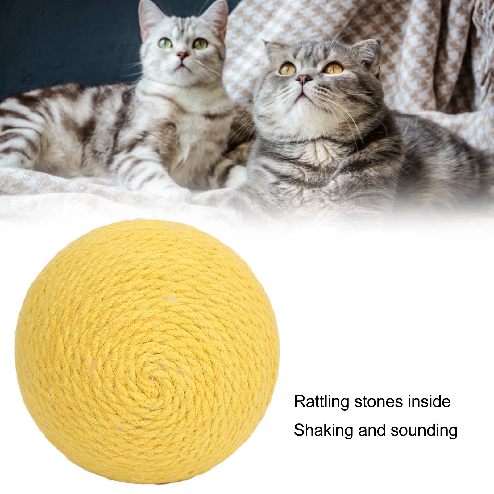 1SHAKING AND SOUNDING: Cat sisal ball is equipped with rattling stones inside, shaking with a rustling sound, bringing a lot of fun to cats. 2SISAL MATERIAL: Sisal cat scratching ball is made of twisted sisal, which is tough, fun to sharpen claws, and can be used for a long time. 3PERFECT FOR CATS: Cat sisal ball toy can be used as a training tool for cats and can also satisfy their natural hobby of moving around. 4EXERCISE YOUR CAT'S CLAWS: Interactive cat sisal ball is non toxic and helps your pet play in a healthier way and helps exercise your cat's claws. 5RELIEVE BOREDOM: Kitten sisal ball will drain your cat's energy and reduce damage to your furniture, allowing you to have a good night's sleep.