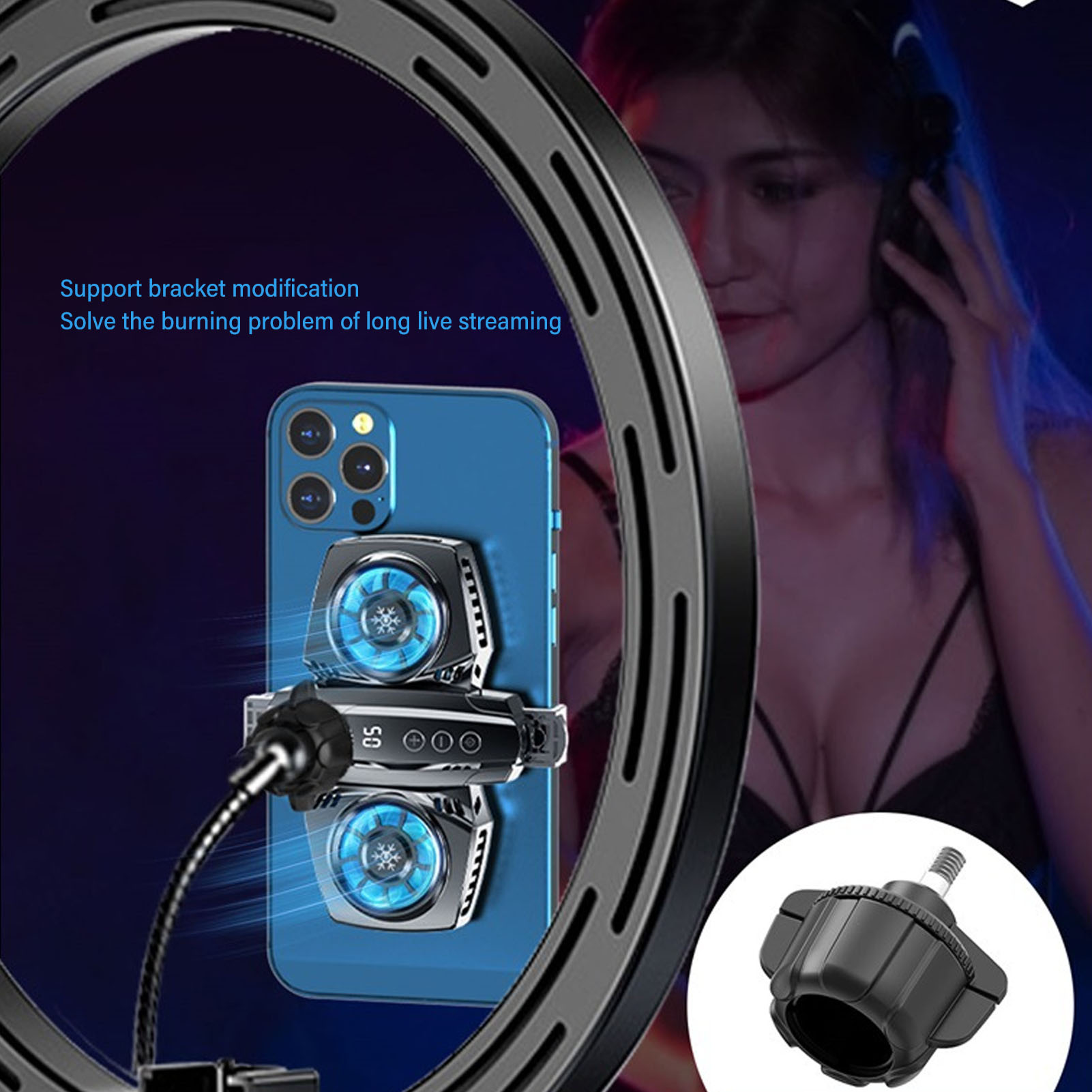 1ABS and Aluminum Alloy Material: The semiconductor phone fan is made of premium ABS and aluminum alloy, durable, suitable for most mobile phones on the market. 2Powerful and Low Noise: Twin turbines and twin engines, strong wind supply, low power consumption and strong power design, with noise reduction, voice chat without interference. 3Dual Core Semiconductor Refrigeration: The heat dissipation speed is 50 times faster, even if live streaming for 10 hours continuously, still has great heat dissipation. 4Energy Saving: When starting, the temperature will drop to 5 degree to reach the preset temperature, enter the intelligent energy saving mode, stop the fan rotation, and start the refrigeration every 90/s to save energy. 5Convenient Design: This cell phone cooling fan supports the modification of the bracket and supports to charge the mobile phone while using, really practical.