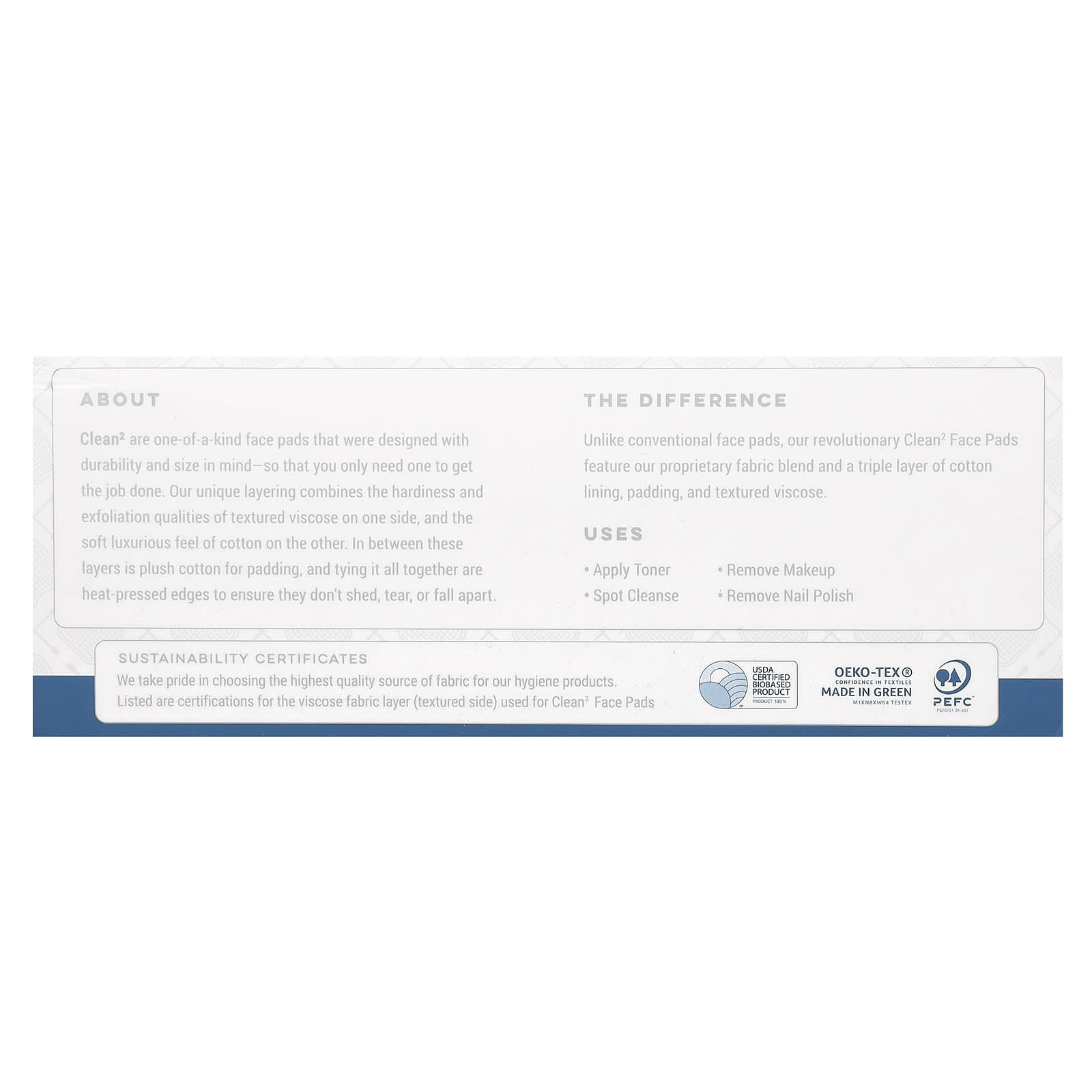 Clean2 are one-of-a-kind face pads that were designed with durability and size in mind-so that you only need one to get the job done. Our unique layering combines the hardiness and exfoliation qualities of textured viscose on one side, and the soft luxurious feel of cotton on the other. In between these layers is plush cotton for padding, and tying it all together are heat-pressed edges to ensure they dont shed, tear, or fall apart.