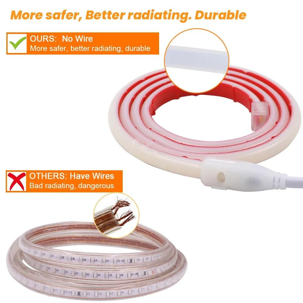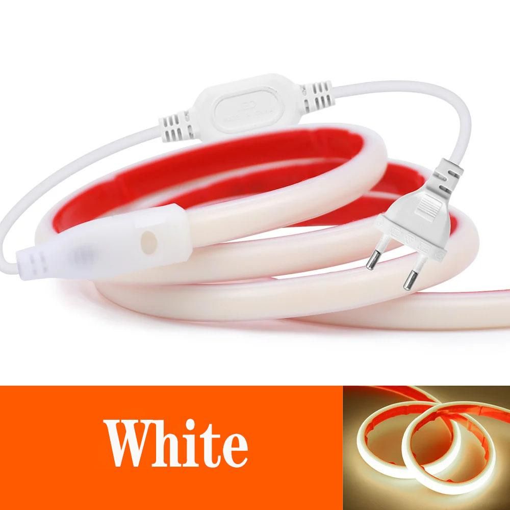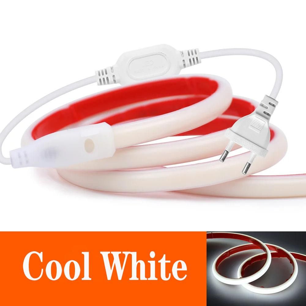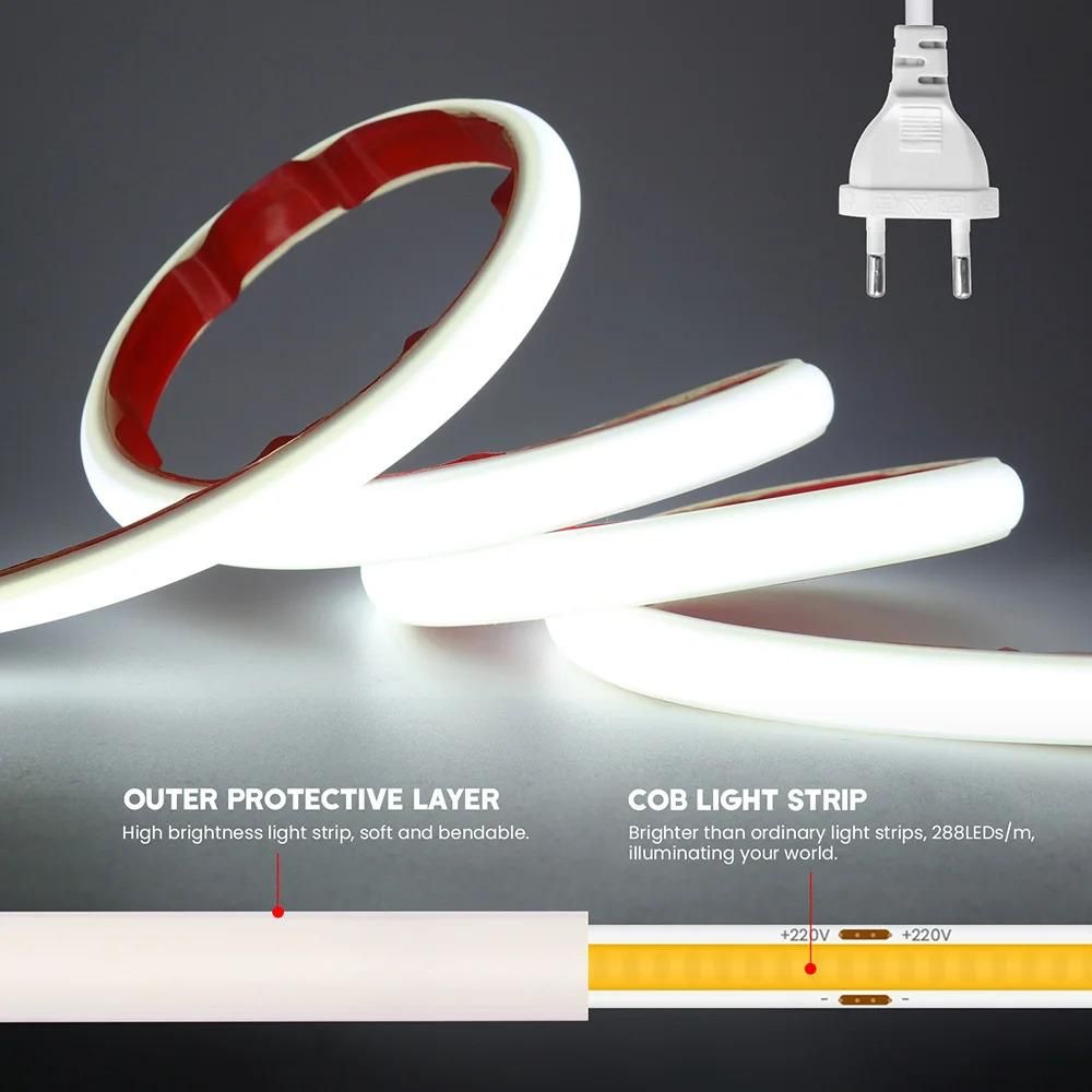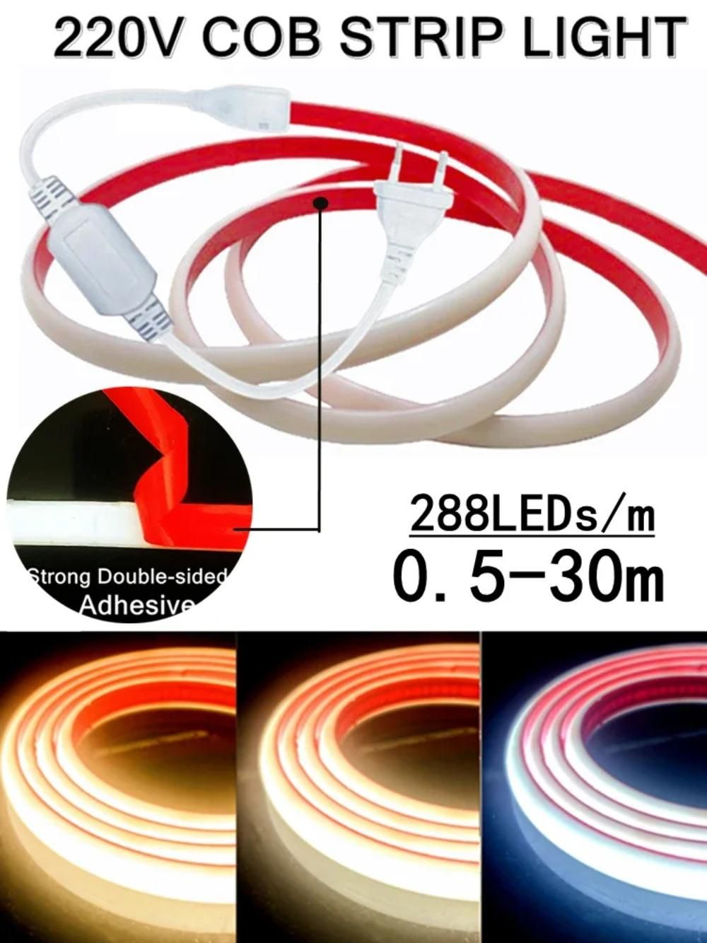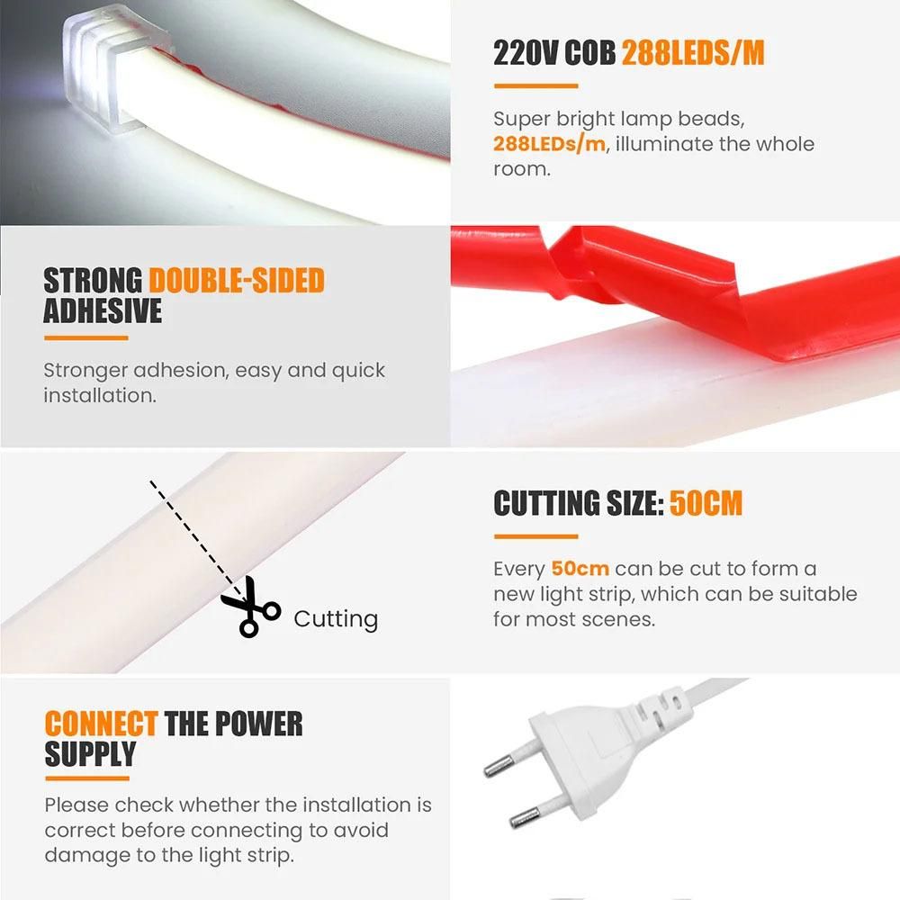 Specifications:Product Name: 220V COB Led Strip Light with Adhesive PowerInput Voltage: AC 220-240VPlug Type: EU power plug(AC220-240V)Number Of Leds: 288LEDs/mCut Length: 50cmLight Color: Warm white (3000-3500K), Cool white (6000-6500K), White (4000-4500K)Color Rendering Index: CRI 90Power: 8-10W/mStrip size: W10mm X H6mmBeam Angle: 180 degreesPower Cord Length: 40-50cmWaterproof rating: IP67 waterproof(Can be used outdoors)Note: The cob light strip cannot be immersed in water, power plug away from water.Features:*288LEDs/M High density COB, linear lighting, high brightness, uniform lighting, no light spot, high color rendering index CRI90+, protect your eyesgood quality, suitable for engineering decoration.*Flexible COB LED strip light is strong and bright, made of High Quality silicone material. It has sticky glue on the back, so you can easily install it on clean, dry, and smooth surfaces. Perfect for quick and easy installation!Package Includes:1 x EU Plug COB Led strip light