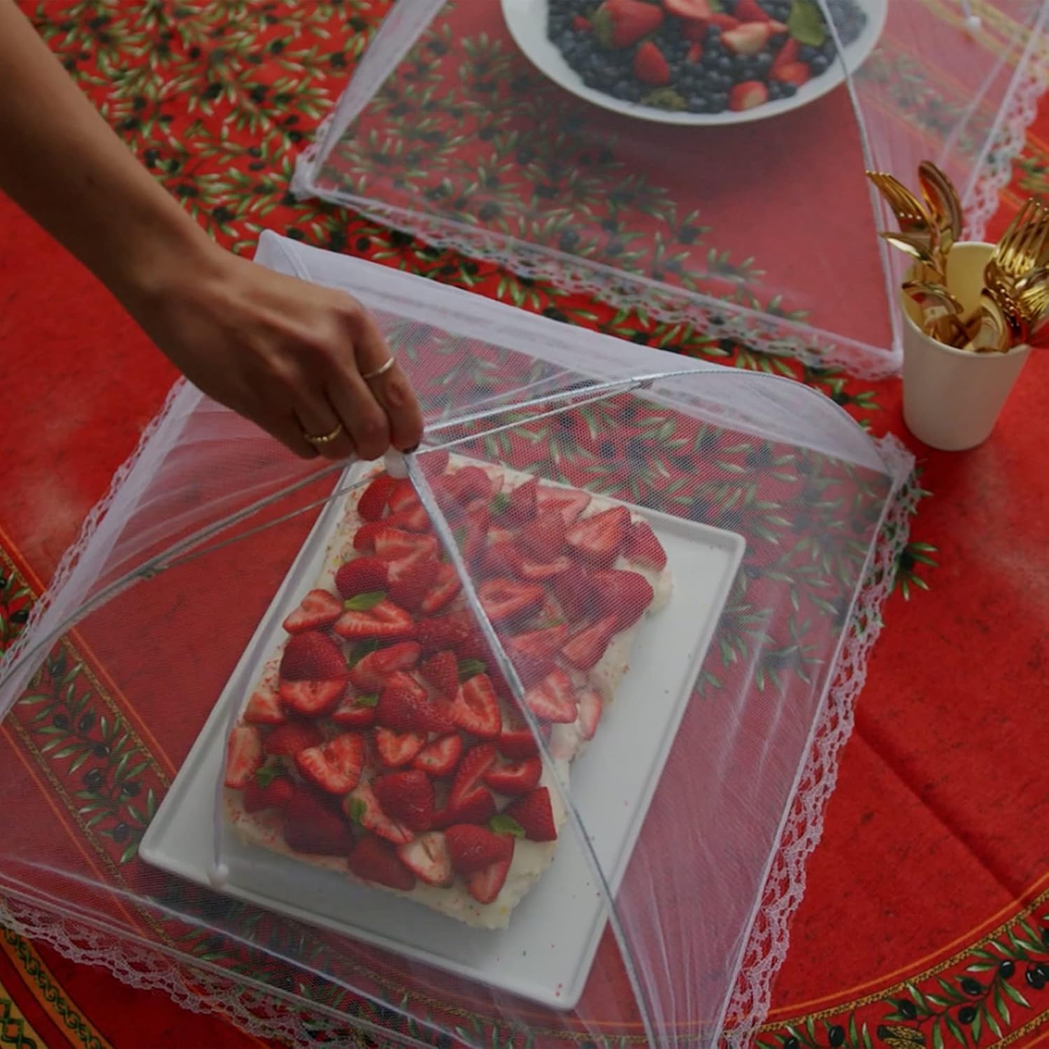 Stylish and Environmentally Friendly: Elevate your outdoor dining experience with these zero-waste food screens. The collapsible food covers feature a delicate lace edging that acts as a barrier against the elements and effectively keeps flies out. Unlike tinfoil, paper towels, or paper plates, these reusable covers provide superior protection for platters of food, while also reducing waste. Make them a part of your party supplies for an eco-friendly and elegant touch.