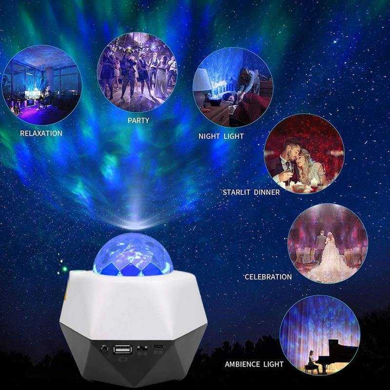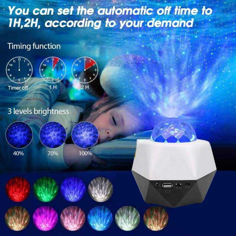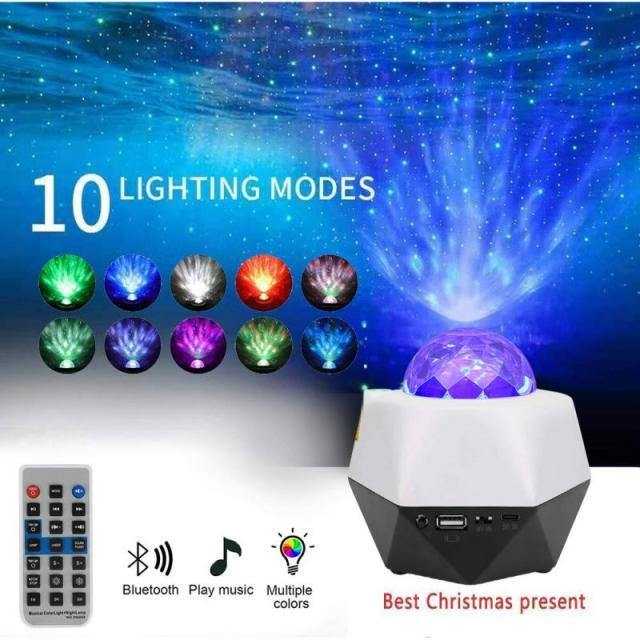 This product is a combination of four-color water pattern light + rainbow circle + green laser. The water pattern has four colors of red, white, blue and green. The laser color is green. The remote control can control the color of the water pattern, the speed of the water pattern, and the water pattern. Pattern mode, Bluetooth mode, water pattern single control, laser single control, brightness, music control, sound control, selection mode, timing function, switch, any mobile phone or other device can be connected when Bluetooth is turned on without checking.