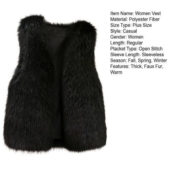 Made of soft, lightweight polyester for comfortable wear in spring, autumn, and winter.Features a beautiful front-open design with furry accents for a stylish look.Casual and loose fit with a solid color makes it easy to pair with skirts, jeans, or overalls.Suitable for various occasions such as daily wear, parties, or music festivals.Perfect for young ladies and teen girls looking to enhance their street casual style. : Introducing our Women's Furry Sleeveless Vest, the perfect addition to your wardrobe. Made from soft and lightweight polyester, this vest is designed to keep you comfortable all day long. Its front-open design and furry surface add a touch of elegance and style to any outfit. Whether you're pairing it with mini skirts, midi skirts, jeans, or overalls, this vest is versatile enough for any occasion. From casual outings to evening parties, it's the ideal choice for young ladies and teen girls who want to look attractive and fashionable. Suitable for spring, autumn, and winter wear, this vest is a must-have for every fashion-forward woman. So why wait? Grab yours now and elevate your style game! Item Name: Women Vest Material: Polyester Fiber Size Type: Plus Size Style: CasualGender: Women Length: RegularPlacket Type: Open Stitch Sleeve Length: Sleeveless Season: Fall, Spring, WinterFeatures: Thick, Faux Fur, Warm Size Details: Size: M, Bust: 92cm, Clothes Length: 59cm(Approx.)Size: L, Bust: 96cm, Clothes Length: 60cm(Approx.)Size: XL, Bust: 100cm, Clothes Length: 61cm(Approx.)Size: 2XL, Bust: 104cm, Clothes Length: 62cm(Approx.)Size: 3XL, Bust: 108cm, Clothes Length: 63cm(Approx.)Size: 4XL, Bust: 112cm, Clothes Length: 64cm(Approx.) Notes: Please refer to our size chart and choose the right size.Due to the light and screen setting difference, the item's color may be slightly different from the pictures. Package Includes: 1 x Women Vest