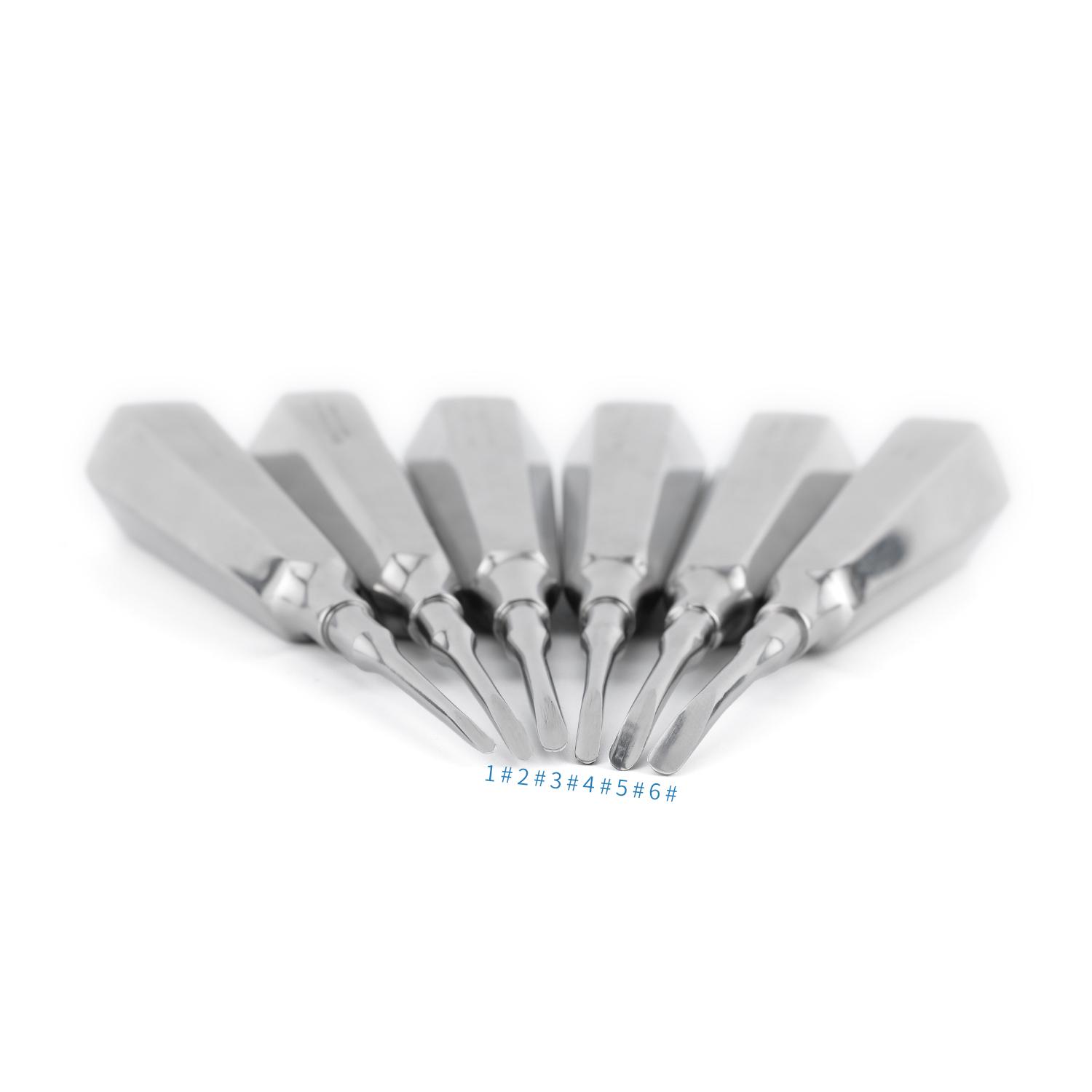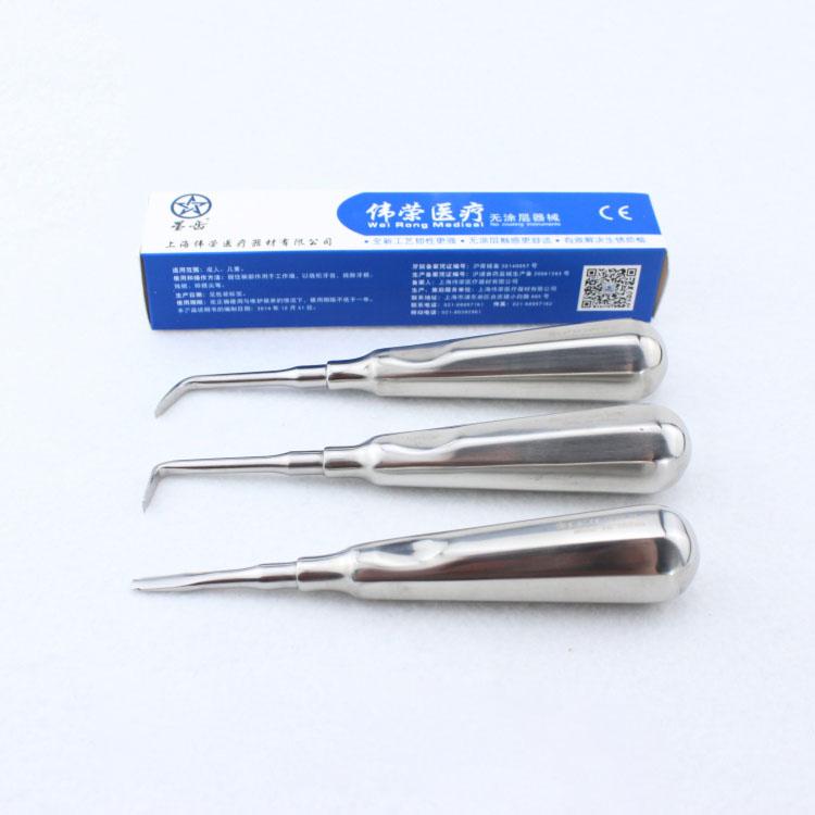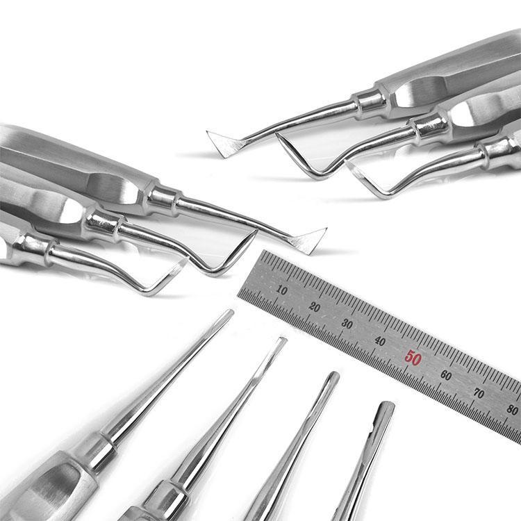 This design principle is based on lever, wheel shaft and wedge three forces design, the most commonly used in clinical work is straight Dental Elevator.The head is hand-polished by more than ten years of technicians, using 3Cr13mov vacuum quenching material, hardness can reach more than 53 degrees. The handle is pure 304 stainless steel with thickness of 1.0. After 6 polishing processes, the product is more delicate, moderate in weight and comfortable in hand.Dental straightening Elevator is suitable for all kinds of tooth extraction, adapted to the shape of teeth, close to the tooth surface, the use of straightening is mainly the use of wedge force. Enlarging the alveolar fossa, separating the object, and at the same time acting as a displacing part of the object through extrusion into the object.Triangular spur Elevator is also symmetrical on the left and right, and the proboscis is concave triangular with thick proboscis, which is mainly used for removing the broken roots of mandibular molars, loosening mandibular molars or removing the alveolar mediastinum.The root proboscis is slender Elevator, paired in left and right directions, and the tappets are bent at angles. It is mainly used for loosening the stump roots or long broken roots.Apical proboscis is thinner, smaller and sharper than the proboscis. Symmetrical, curved tappet and straight apical stand three, combined for a set. Clinical use for root apical root extraction.Used for all kinds of tooth extraction, it is suitable for the shape of teeth, close to the surface of teeth, and the use of straight stiffening is mainly to use wedge force to expand the alveolar fossa, separate objects, and play a role of replacing part of objects through extrusion into the object.