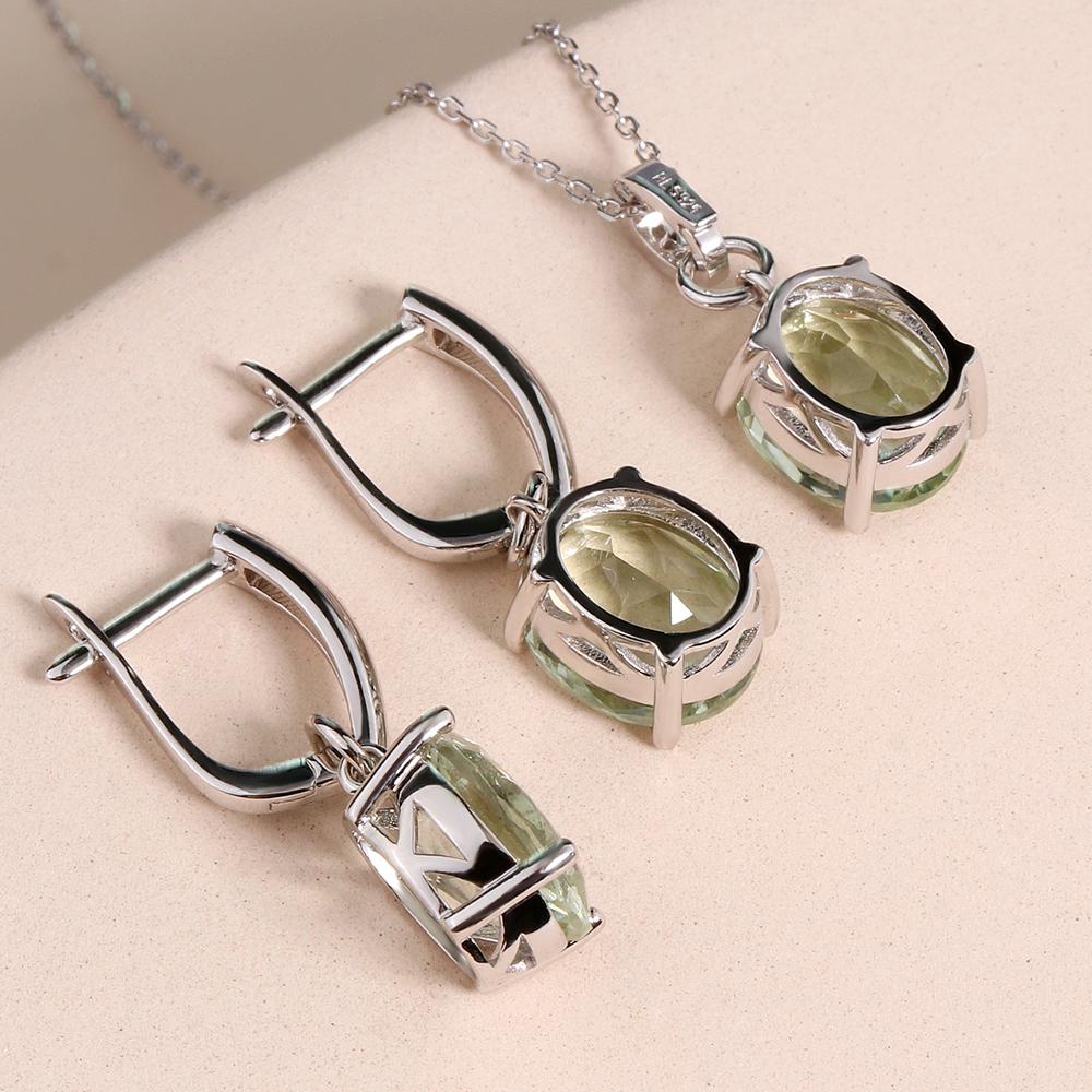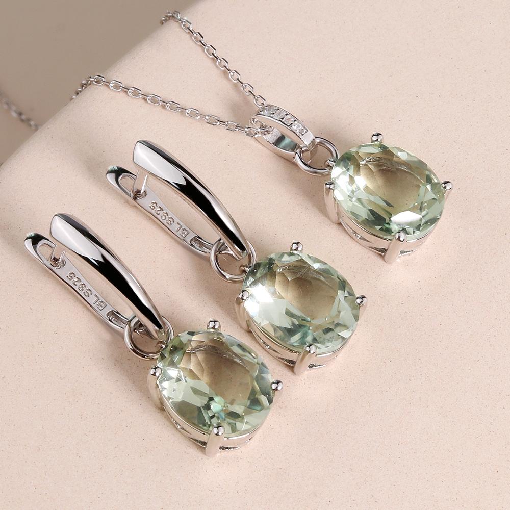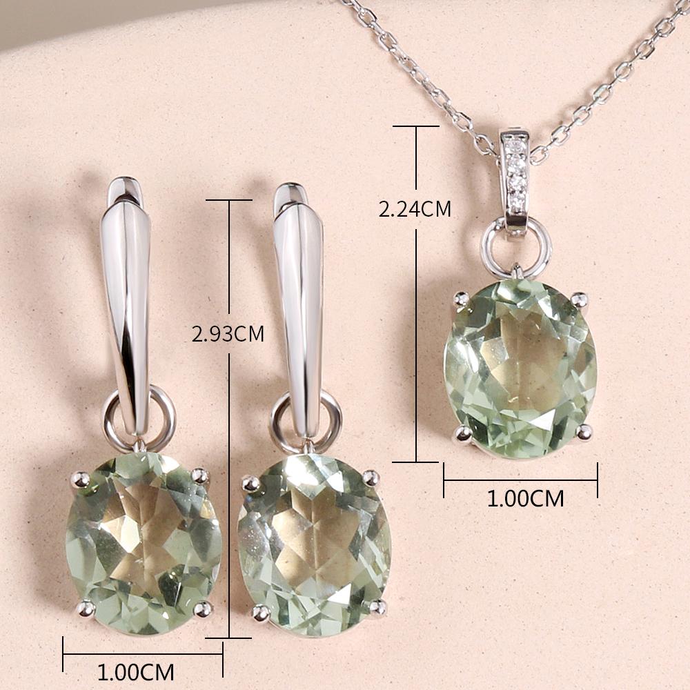 Material:925 Sterling silver EarringAndNecklaceweight:approx.8gramMain stone material:Natural Green crystal oval 10*12mmSide stone:cubic zirconNecklace length:45cmExtension Length:noPacking:1*pendant,1* Earring1*Jewelry Box, 1* Silver polish clothProduct Type:Jewelry set for women