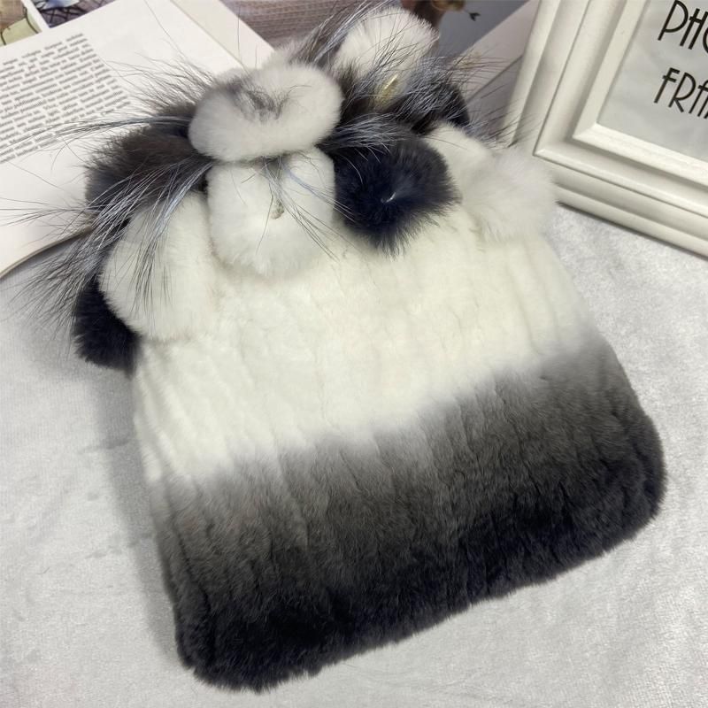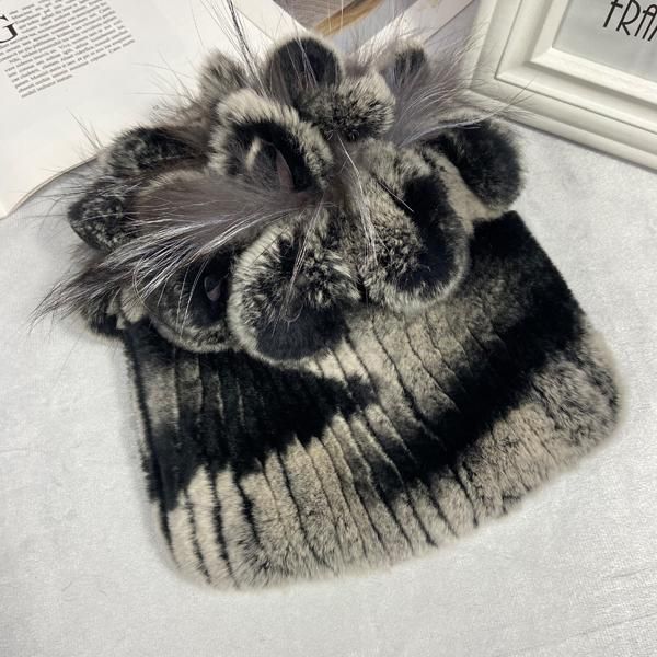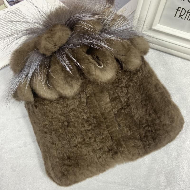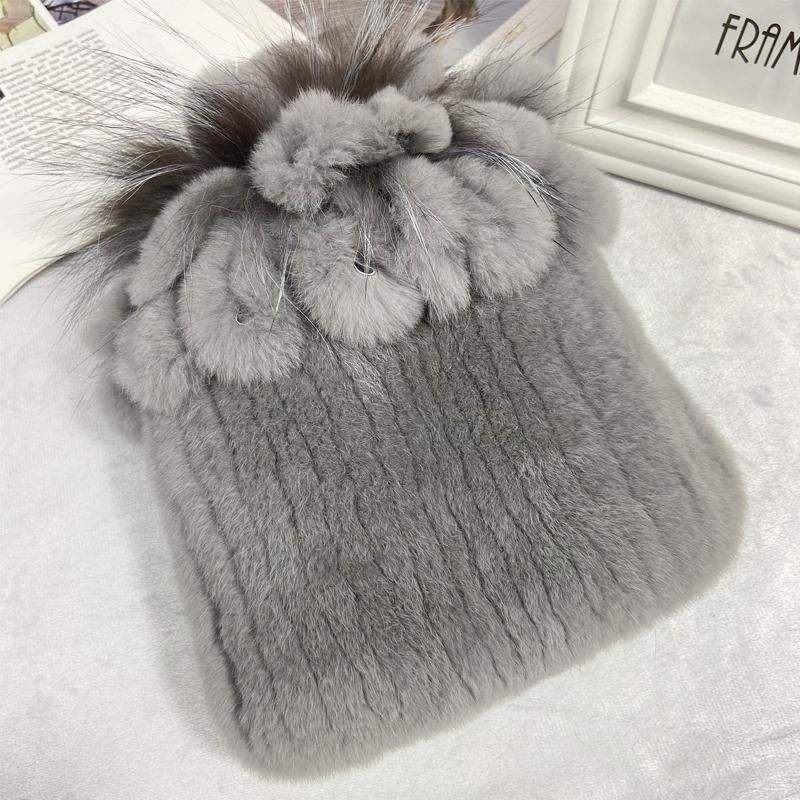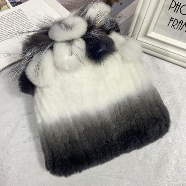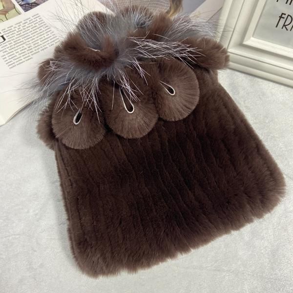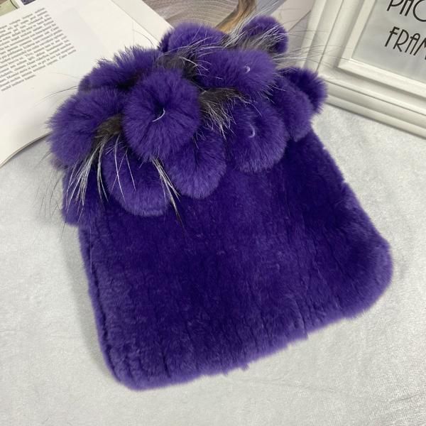Material: rabbit fur 100%Size: 20cmx24cmx4cmElastic, suitable for head circumference 55-60cmLabel: YesWashing care: dry clean