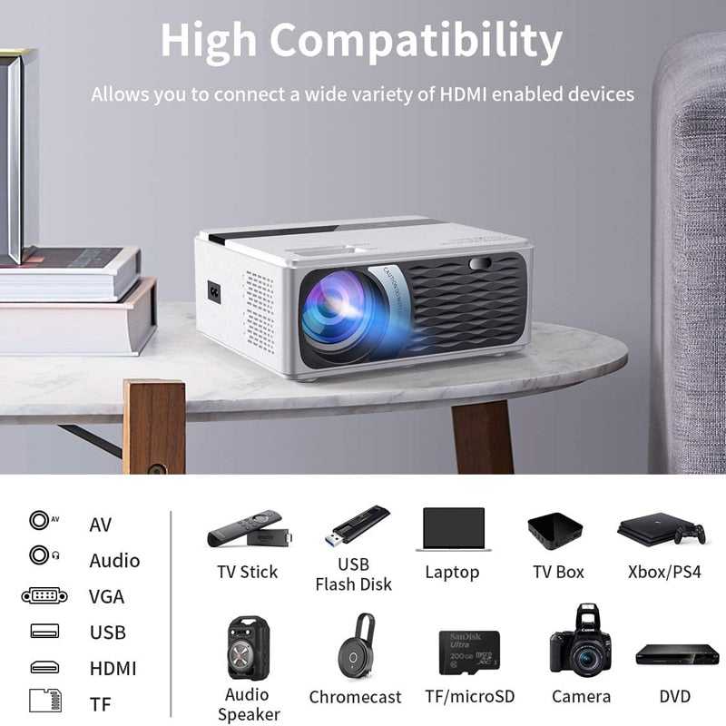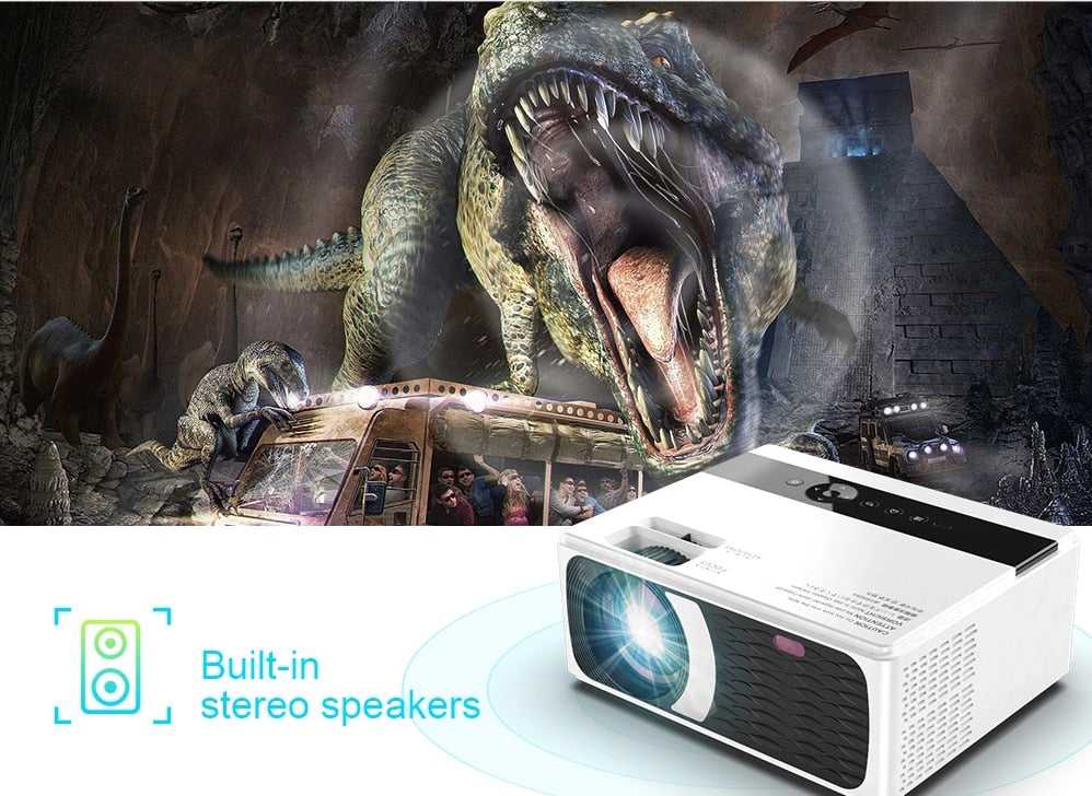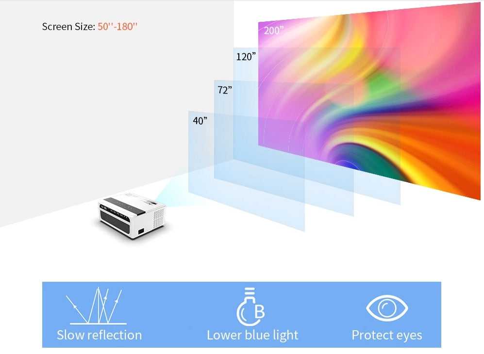 Adopted the latest smart LED lamp care technology. The life of the lamp is 30000 hours, which means it can last for at least 4years. Get rid of getting a replacement lamp, just enjoy your movie without any worries. 4.3inch full LCD, high-definition video projector, high-efficiency LED light, the latest engine technology 8000 lumens,dynamic color compensation technology, colorful and high color reduction, warm color, high brightness, clear graphics, to ensure the best video experience. 1280 x 720P native resolution, high-definition imaging Support 1920 x 1080P decoding, two times higher than 800 x 480P 2000:1 contrast ratio.