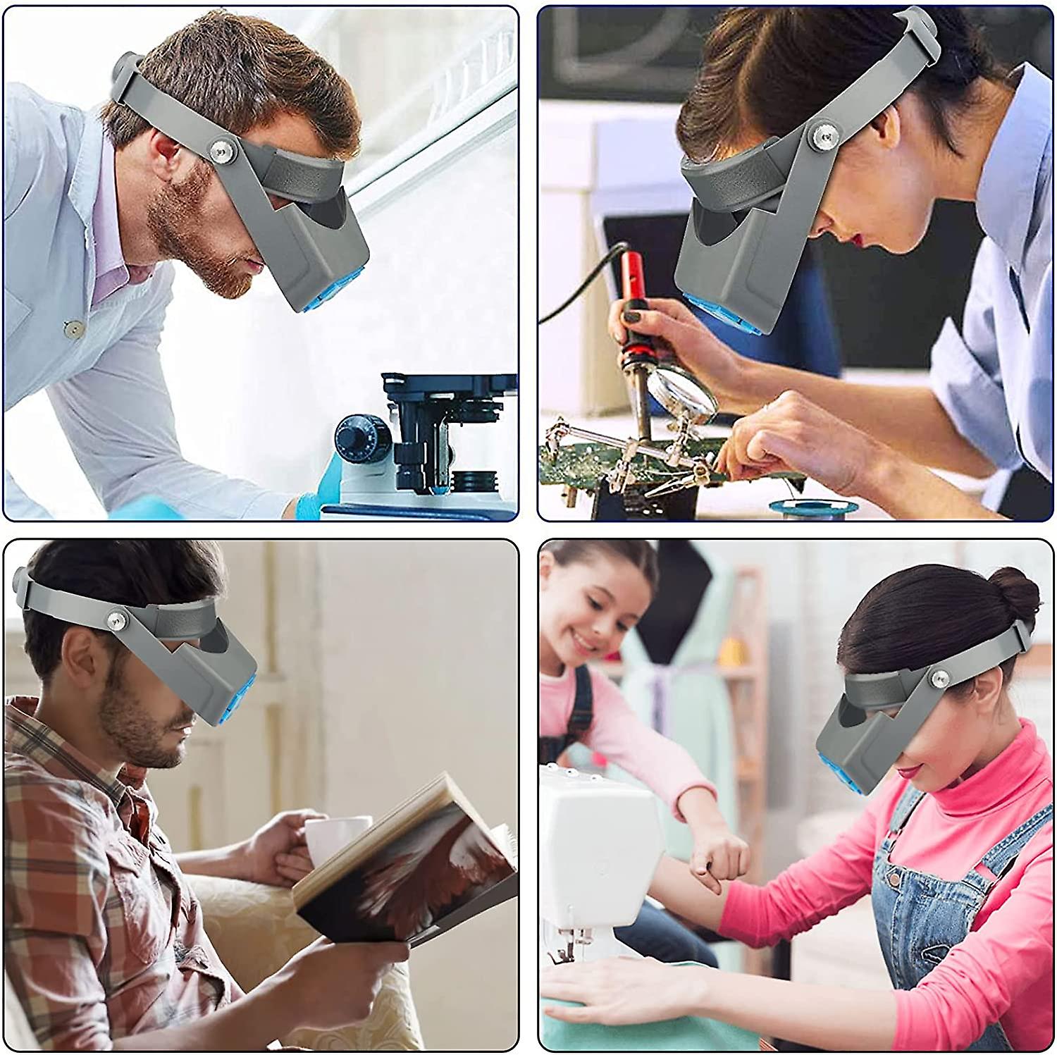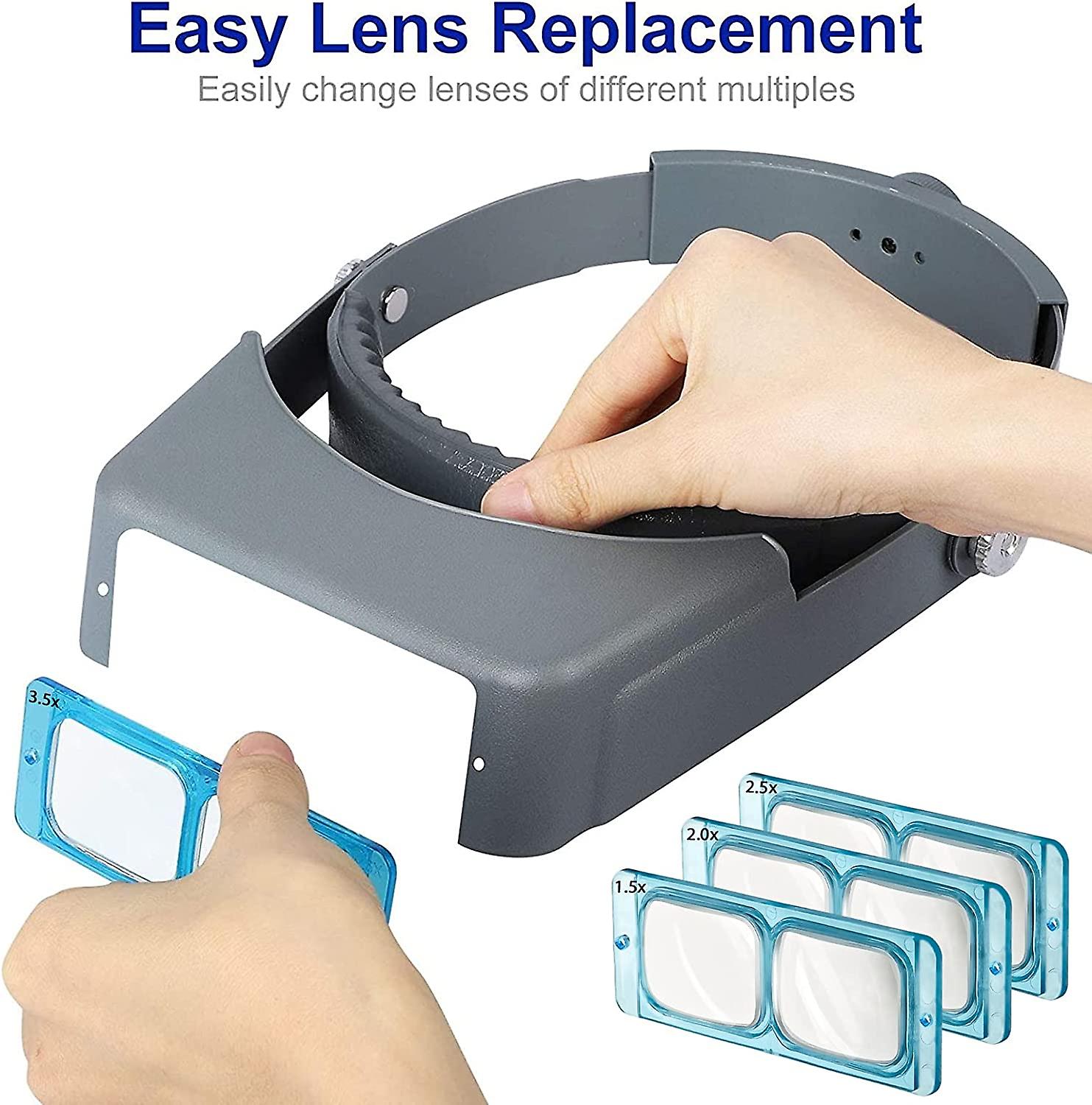 EASY TO USE: The headband of magnifying glasses is adjustable and easily fits your head and even over your regular glasses or safety goggles. The visor is adjustable and can be tilted up and down as needed COMFORTABLE TO WEAR: You can adjust the switch at the back of the headband to a proper size to wear. Two knobs on both sides can adjust the height of the magnifier to meet your request view angle. Lightweight material and soft breathable sponge inside will make you will feel comfortable when operating 4 INTERCHANGEABLE LENSES: The headband magnifier with 4 interchangeable lenses, 1.5X at 15" focal length, 2.0X 10", 2.5X 7", and 3.5X 6" WIDELY APPLICATION: The hands-free multi-power combined lens magnifications can meet your requirement for different use: reading, painting, observing, modeling, repairing, beading, sewing, soldering, jewelry making, close work, needlework, artwork, and other hobbies/crafts. A very important visual tool for persons involved in the watch, delicate instrumentation and small work WHAT YOU GET: One head mount magnifier, 4 interchangeable lenses, it is a great gift choice for the elder or anyone needs it for close work