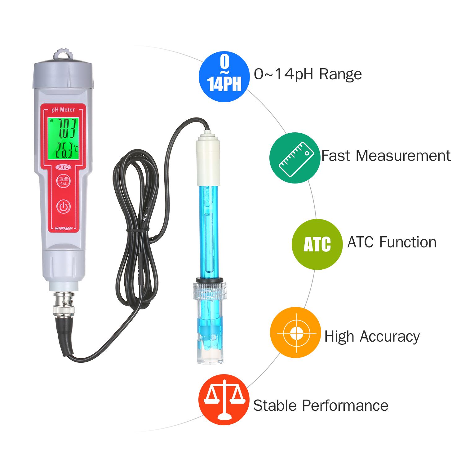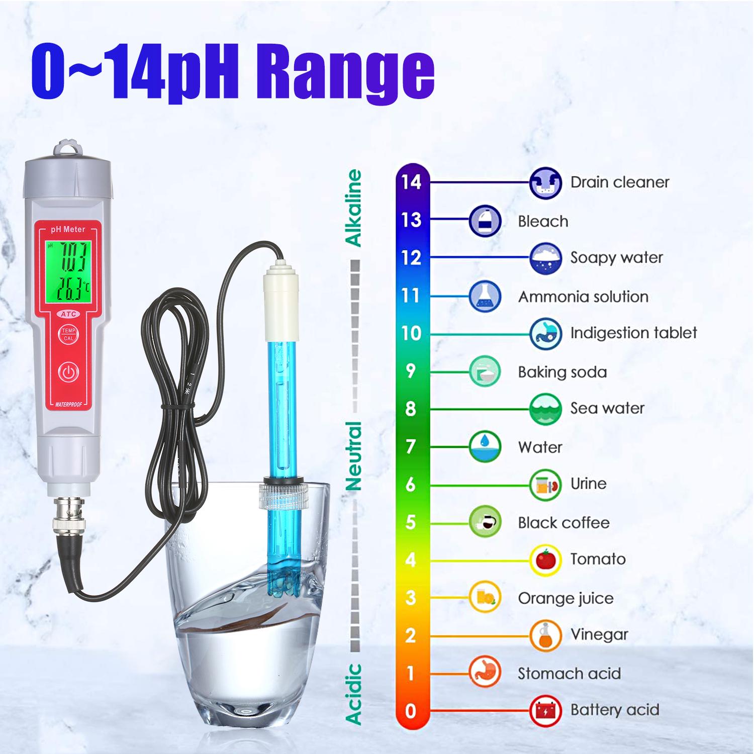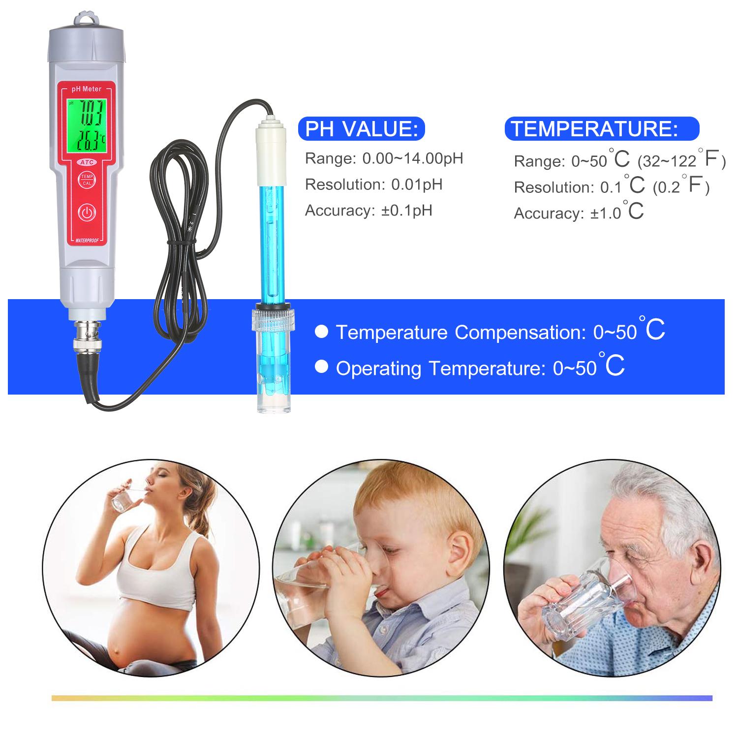 The pH meter is used for fast measuring liquid pH values and display the temperature of the object to be tested simultaneously. Features of easy operation, stable performance and accurate measurement, the pH meter is widely used in the aquaculture, fish pond, fish tank, other industrial and agricultural production and scientific research that need to test the pH value and water quality.Features:Dual Functions: for rapid measuring the pH value and temperature of the tested liquid.pH Value Measuring: 0.00~14.00pH measurement range, 0.01pH resolution, and +/-0.1pH accuracy.Temperature Measuring: 0~50 celsius (32~122 Fahrenheit ) measurement range, 0.1 celsius (0.2 Fahrenheit ) resolution, and +/-1.0 celsius accuracy, celsius / Fahrenheit temperature unit switchable. ?Reliable Quality: high sensitivity waterproof probe smart chip for fastly and accurately measurement, and 1.2-inch clearly LCD screen with green backlight dual display the pH value and temperature.Portable Compact Design: mini pen type pH meter, just powered by 4pcs LR44 button cell batteries, long term standby, conveniently for carrying around and real-time measurement anytime anywhere.Wide Applications: can be used in the aquaculture, fish pond, fish tank, other industrial and agricultural production and scientific research that need to test the pH value and water quality.Specifications:Model: pH-618B / pH-618L (Optional)Material: ABSRange:pH: 0.00~14.00pHTemperature: 0~50 celsius (32~122 Fahrenheit )Resolution:pH: 0.01pHTemperature: 0.1 celsius (0.2 Fahrenheit )Accuracy:pH: +/-0.1pHTemperature: +/-1.0 celsius Temperature Compensation: 0~50 celsius Operating Temperature: 0~50 celsius Supply Supply: 4 * 1.5V LR44 button battery (NOT included)Screen Size: 25 * 18mm / 0.98 * 0.71inMini Screwdriver Size: 91 * 10mm / 3.19 * 0.39inItem Size: 175 * 37mm / 6.89 * 1.46inItem Weight: 124g / 4.37ozPackage Weight: 410g / 14.46ozPackage Size: 19.5 * 16.8 * 5.5cm / 7.68 * 6.61 * 2.16inPacking List:1 * pH Meter1 * Mini Screwdriver1 * Electrode1 * Storage Case1 * Manual (English)