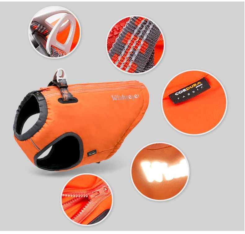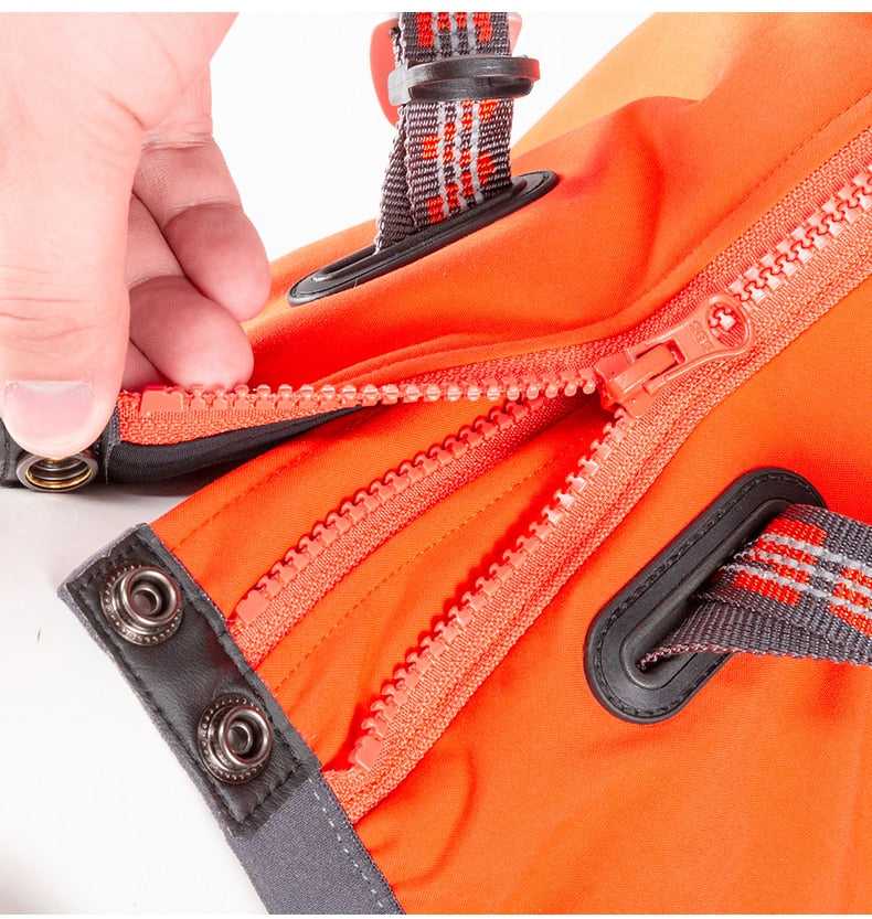 COMBINATION HARNESS/VEST/JACKET with Integrated Design allows this Multi-Purpose Garment to be worn in a Variety of Conditions. Keeps you pup warm, dry, and happy.