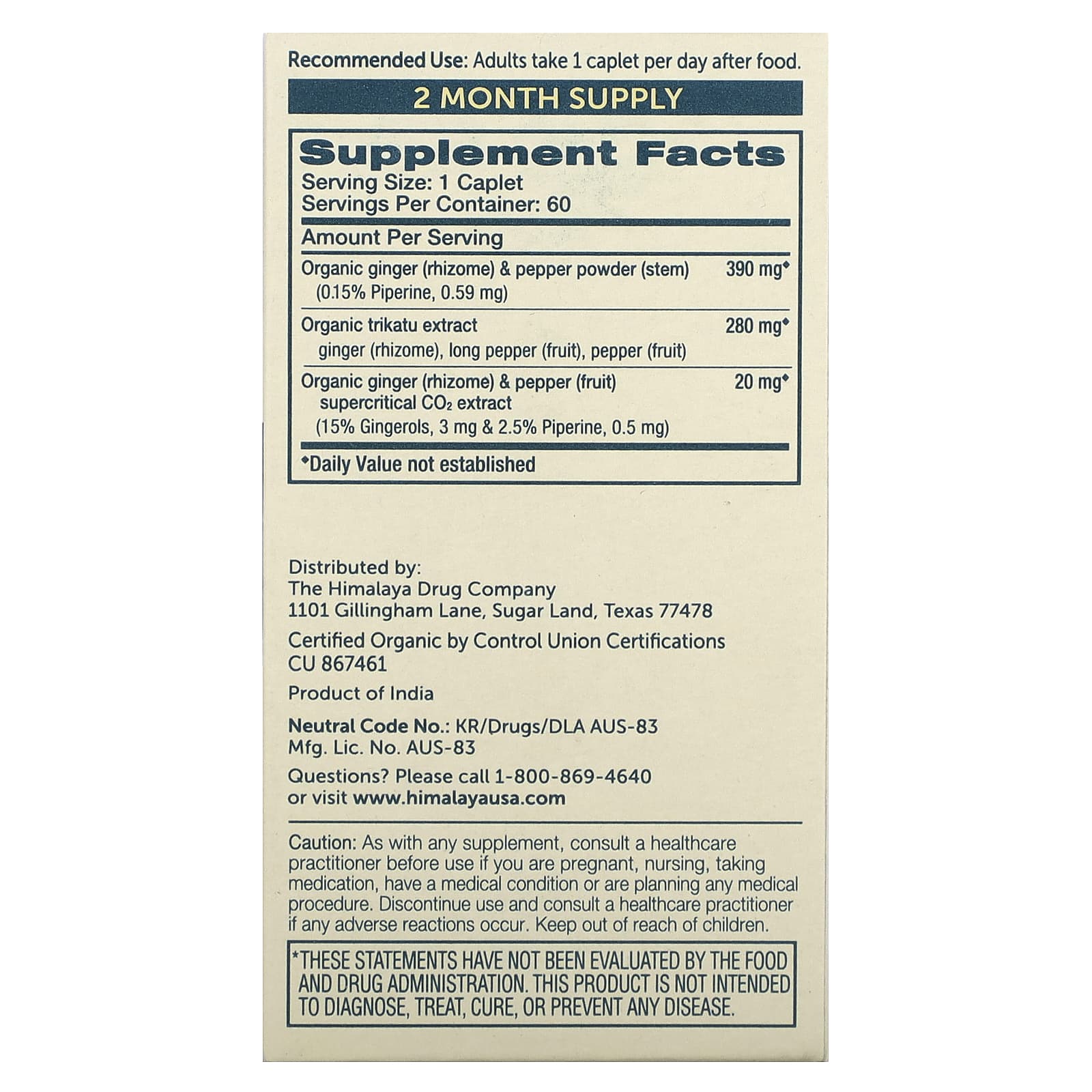 Each Himalaya Organic Trikatu caplet is equivalent to 3,670 mg of Organic Trikatu powder per serving.