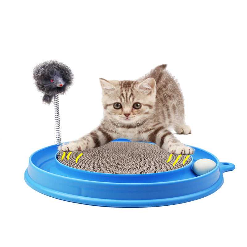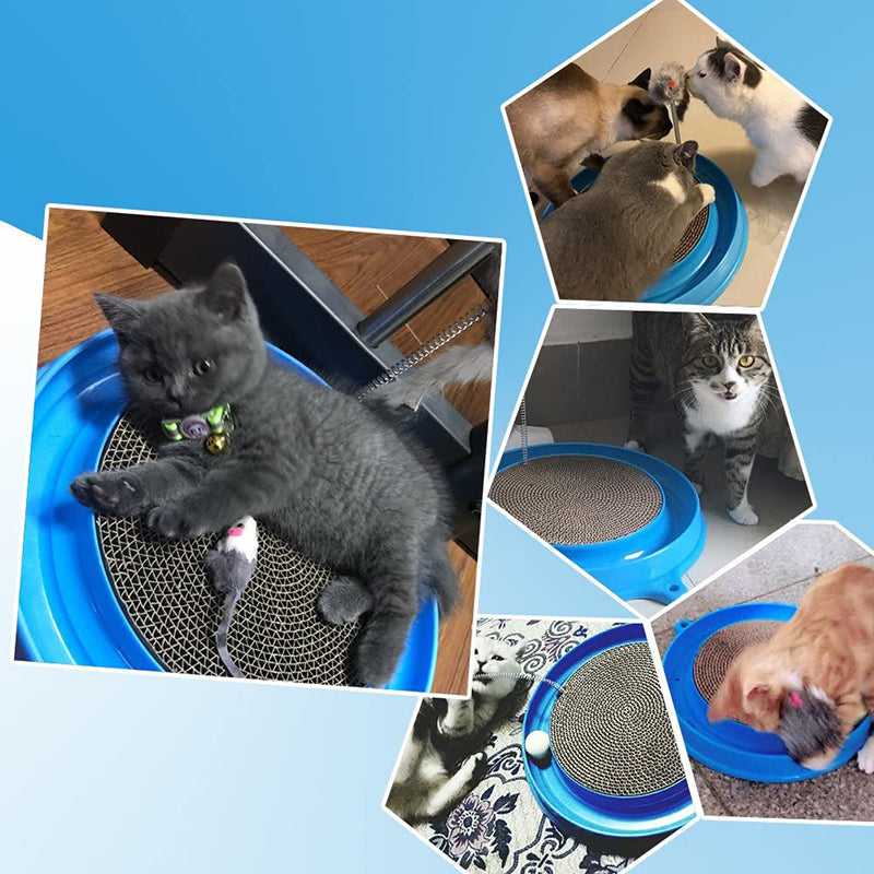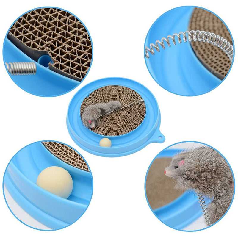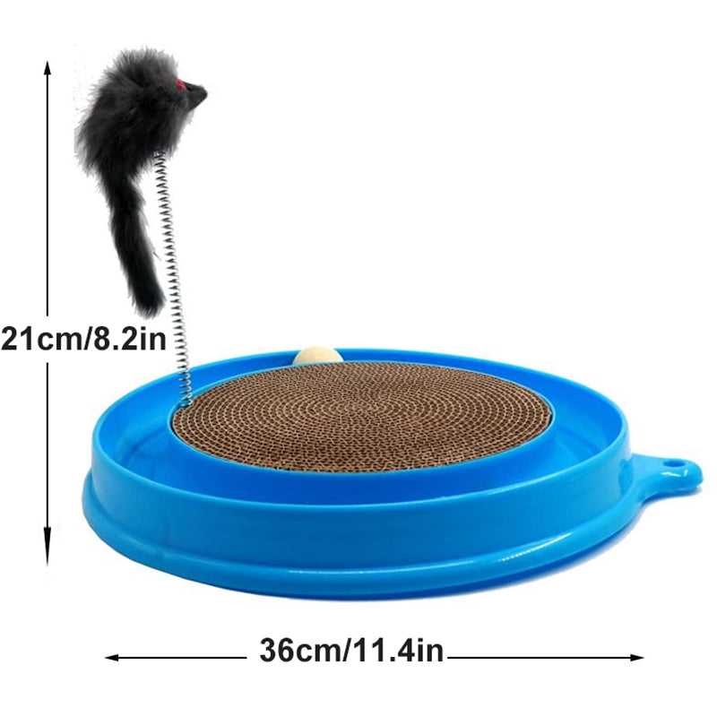1 base (36cm/14" diameter), 1 round corrugated cardboard scratcher, and 1 ball and 1 Mouse Swatter; place ball in track for hours of fun - entertain your cat and keep away your furniture from scratching!