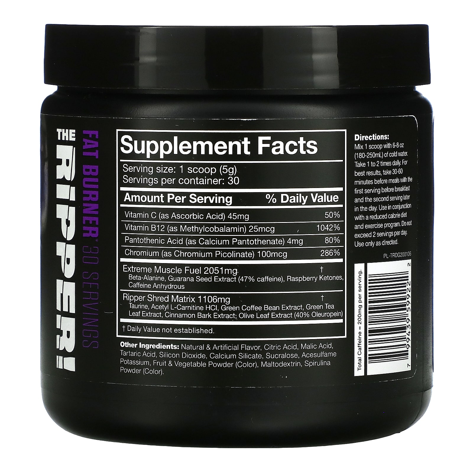 Natural & Artificial Flavors Dietary SupplementManufactured in a GMP Compliant FacilityGluten Free Vegan Friendly Supercharge your body's fat burning engine with the unworldly power of The Ripper!, the Fat Burner designed for hardcore users only. Feel the Ripper! go to work after the very first dose. The Ripper! is the Ultimate Fat Burner. This is what it feels like to be plugged into lightning!Natural and artificial flavor, citric acid, malic acid, tartaric acid, silicon dioxide, calcium silicate, sucralose, acesulfame potassium, fruit & vegetable powder (color), maltodextrin, spirulina powder (color).Produced on equipment that also processes peanuts, tree nuts, milk, egg, wheat, shellfish, fish, soy.