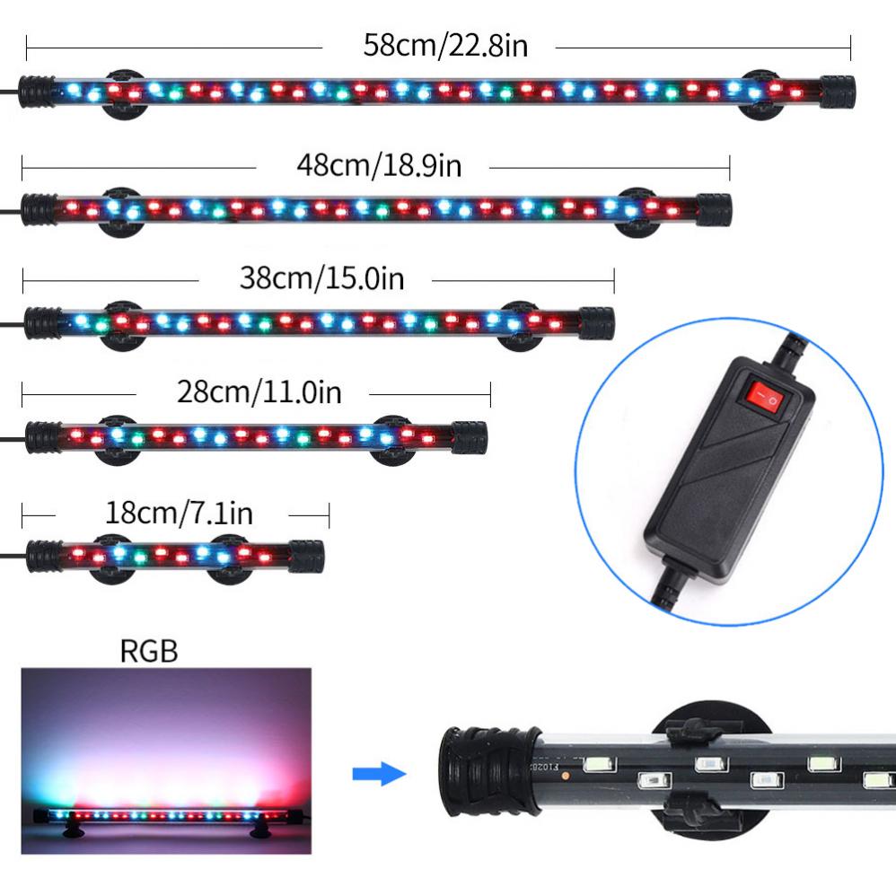 Parameter Information:Is Bulbs Included: YesPower Source: ACVoltage: 110V/220VCertification: CCCBody Material: ABSApplicable Occasions: AquariumOrigin: ChinaLight Source: LED BulbsApplication: AquariumProtection Level: IP68Product Features:IP68 Waterproof Aquarium Lights, 5730 super lamp beads.Brighten color, ice blue, emerald green, brilliant red three color lamp bead, make the brilliance more beautiful.Suitable for aquarium ornamental fish, let the garden pond to get ideal atmosphere and beauty.Light Color: Blue + Green + RedVoltage: AC 90 - 260VPower: 4W, 6W, 8W, 10W, 12WLength: 18cm, 28cm, 38cm, 48cm, 58cmRetail Packaging: Yes, General BoxPackage Include:1 x LED Aquarium Light