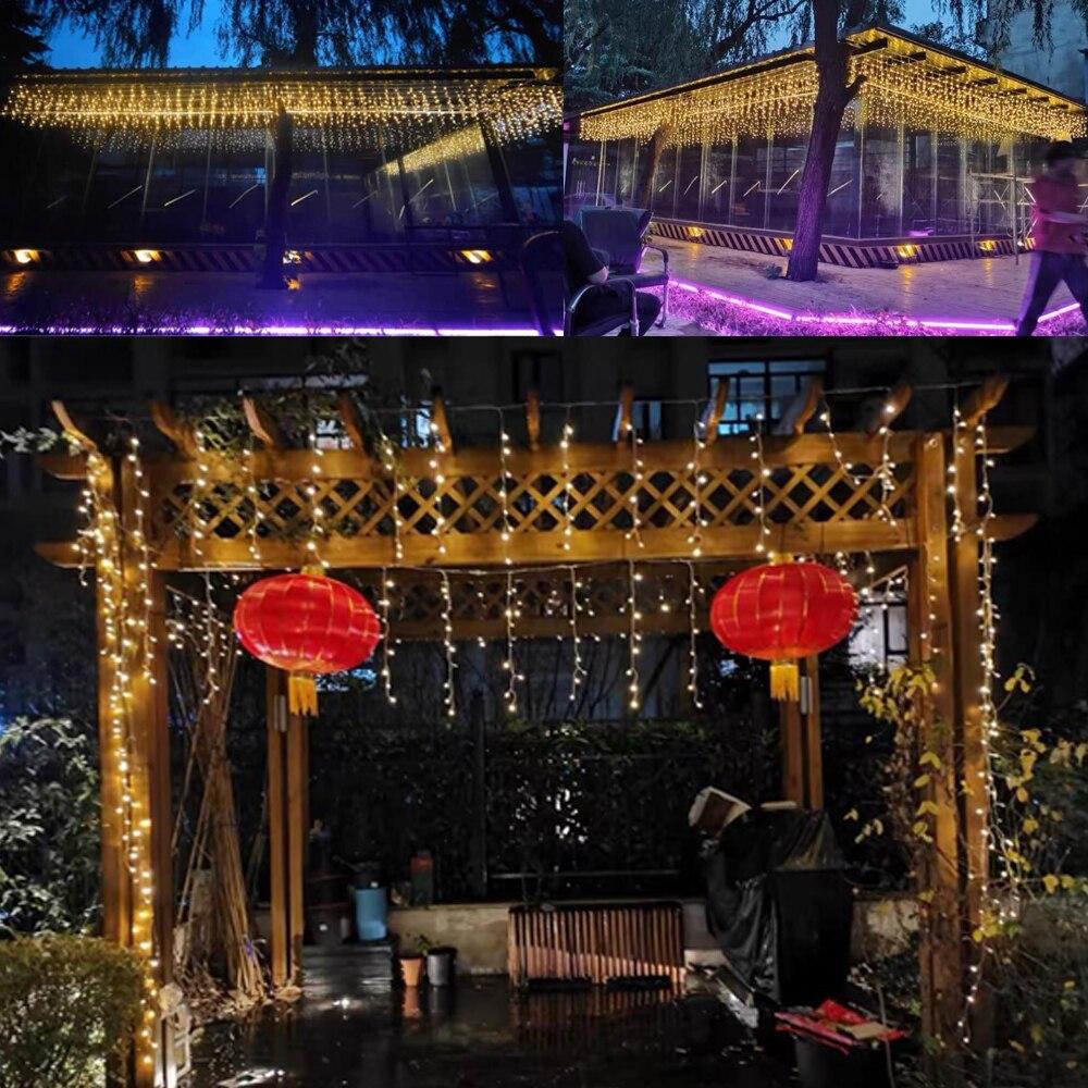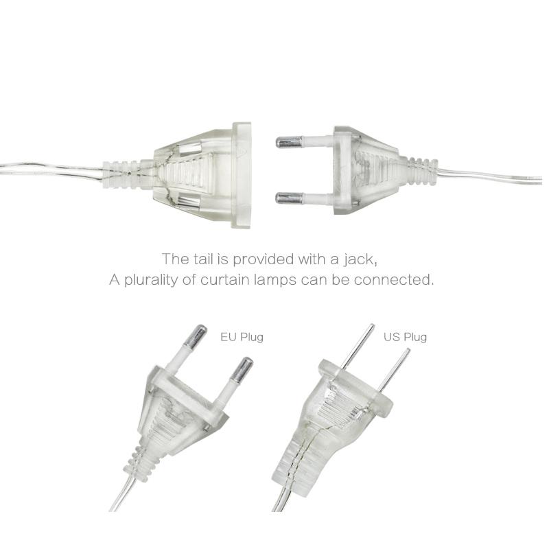 Specification:Color: Warm white / white / multicolor / blueVoltage: AC220V 110V (EU Plug ) Droop quantity: 16 linesLED quantity: 96 pcsSize: 5M (W) x 0.4 m(H)/0.5 m (H)/0.6 m (H)Material: PP TPR CR-V steelPlug to connector: Total 5 meters longThe middle line (String Length) : 4 meters8 Flashing Modes: Combination/In Waves/Sequential/Slow-glow/Chasing Flash/Slow Fade/Twinkle Flash/Steady On.