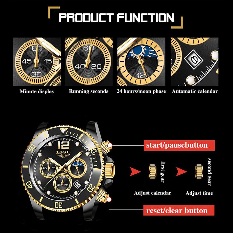 Brand:LIGEModel:LG8924Watchtype:menStyle:Sports,Casual,Fashionluxury-NewwithtagandWatchamovement:OriginalJapanQuartzMovementStrapmaterial:Stainless steelDial Window Material :HardlexCase Material:Stainless steelDialshape:roundDisplaymode:AnalogLookatthecolor:asshowninthepictureWithbutton:BuckleSpecifications(estimated):-CaseDiameter:45mm-Casethickness:13.5mm-Bandwidth:22mm-TotalLength:220mm-Packagecontains1xUserManual1xWipingcloth1xOriginalWatch1xBlackBrandWatchBox1xwatch band Adjustmenttool1.Asabirthday,holidaygift,itisagreatchoiceforfamily,friends,oryourself.2.Elegantandsimplewatches.Thisistherightchoiceforeverydayclothesandyouwillloveit.3.Comfortablewatchband:forcomfortablewrists.Withawatchconnectiontool,youcaneasilyadjustthebeltlength.