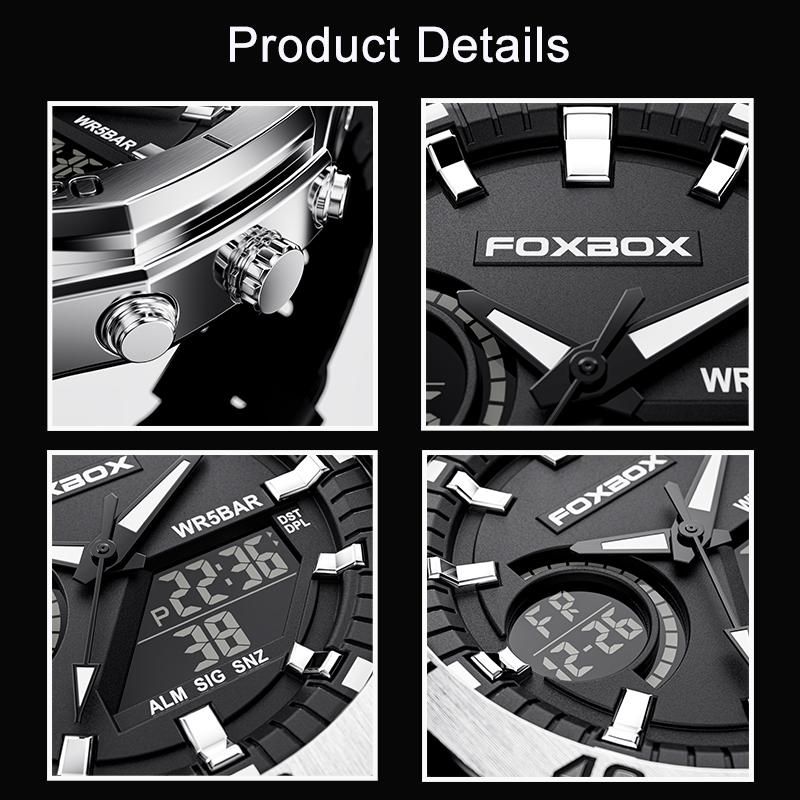 Perfect for Gifts!!!Product Details-NewwithtagandStyle:Sports,Casual,Business,FashionDual DisplayWatchamovement:OriginalJapanQuartzMovementDial diameter: 48 mmCase thickness: 15 mmWatch length: 260 mmBand width: 24 mmWatch weight: 59 gBand Material: SiliconeFeatures:Digital Watch:Dual time shows with LED backlight function and shockproof, automatic date, alarm clock, Stop Watch and other functions.Waterproof Watch:64Ft / 50M water resist. Please DONOT press any buttons under water, and in case of damaging waterproof ring, please keep it away from steam and hot water. material:Stainless Steel case; silicone band with buckle clasp easy to wear and ajust the length as per the wrist size.Unique gift:A surprise gift for a lover or friend,such as Fathers Day,Anniversary,Valentines Day,Christmas,Graduation,Party,Business Gift,etc.Package contains1 x User Manual1 x Wiping cloth1 x Original Watch1 x Brand Watch Box